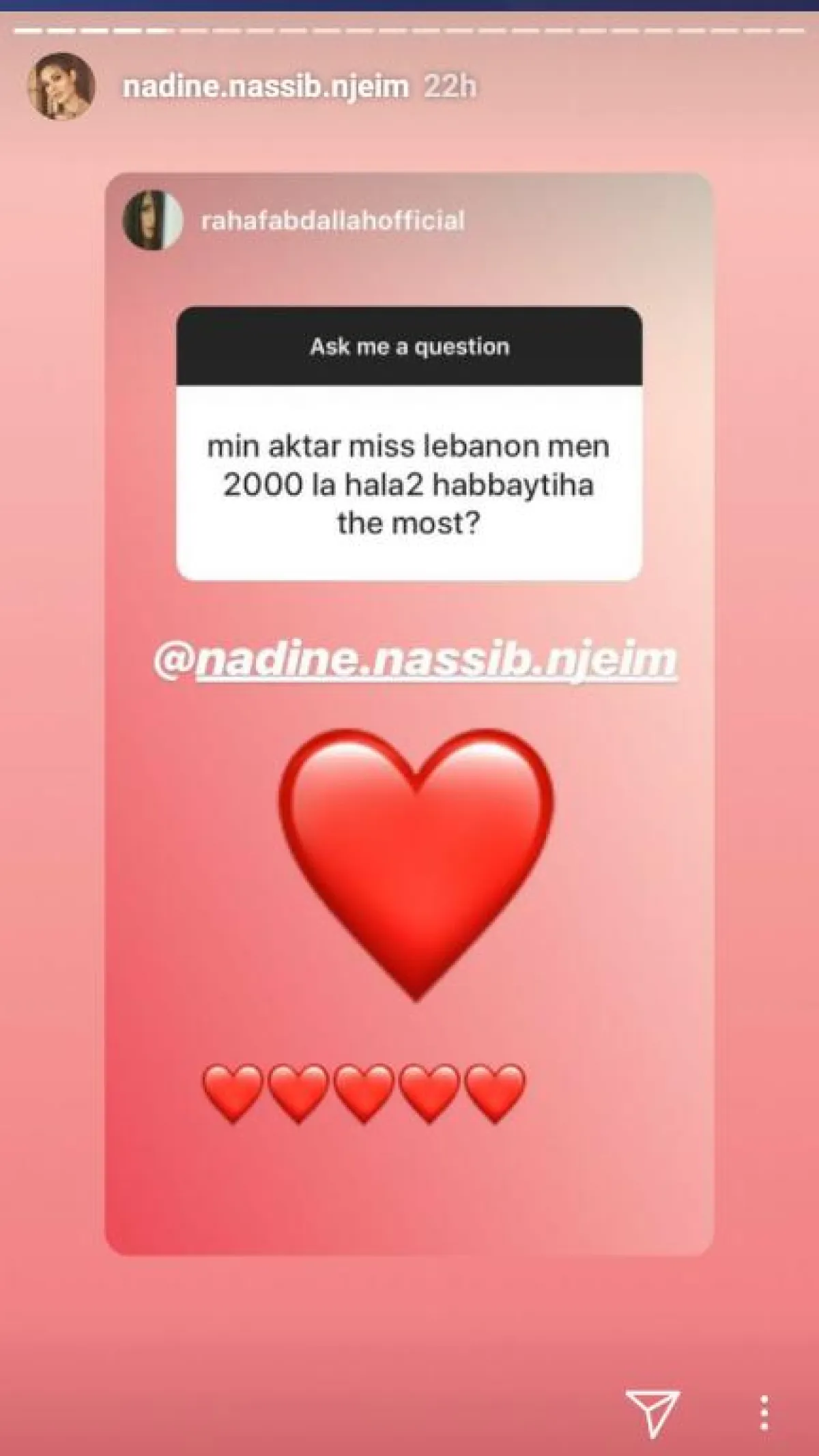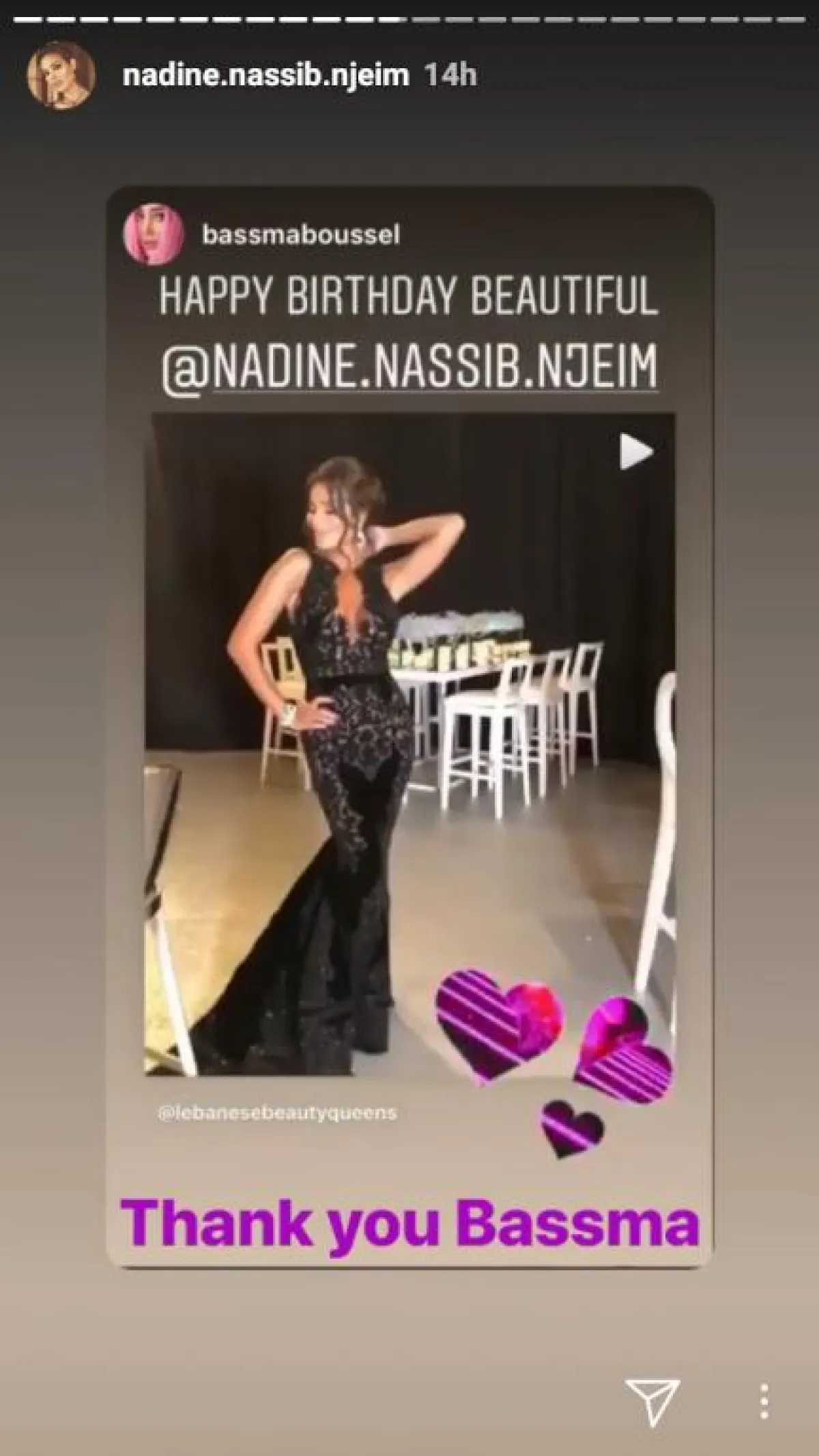 يشار إلى أن الفنانة بلقيس كانت أول من بادر إلى تقديم التهاني لـ نادين نجيم بمناسبة عيد ميلادها.