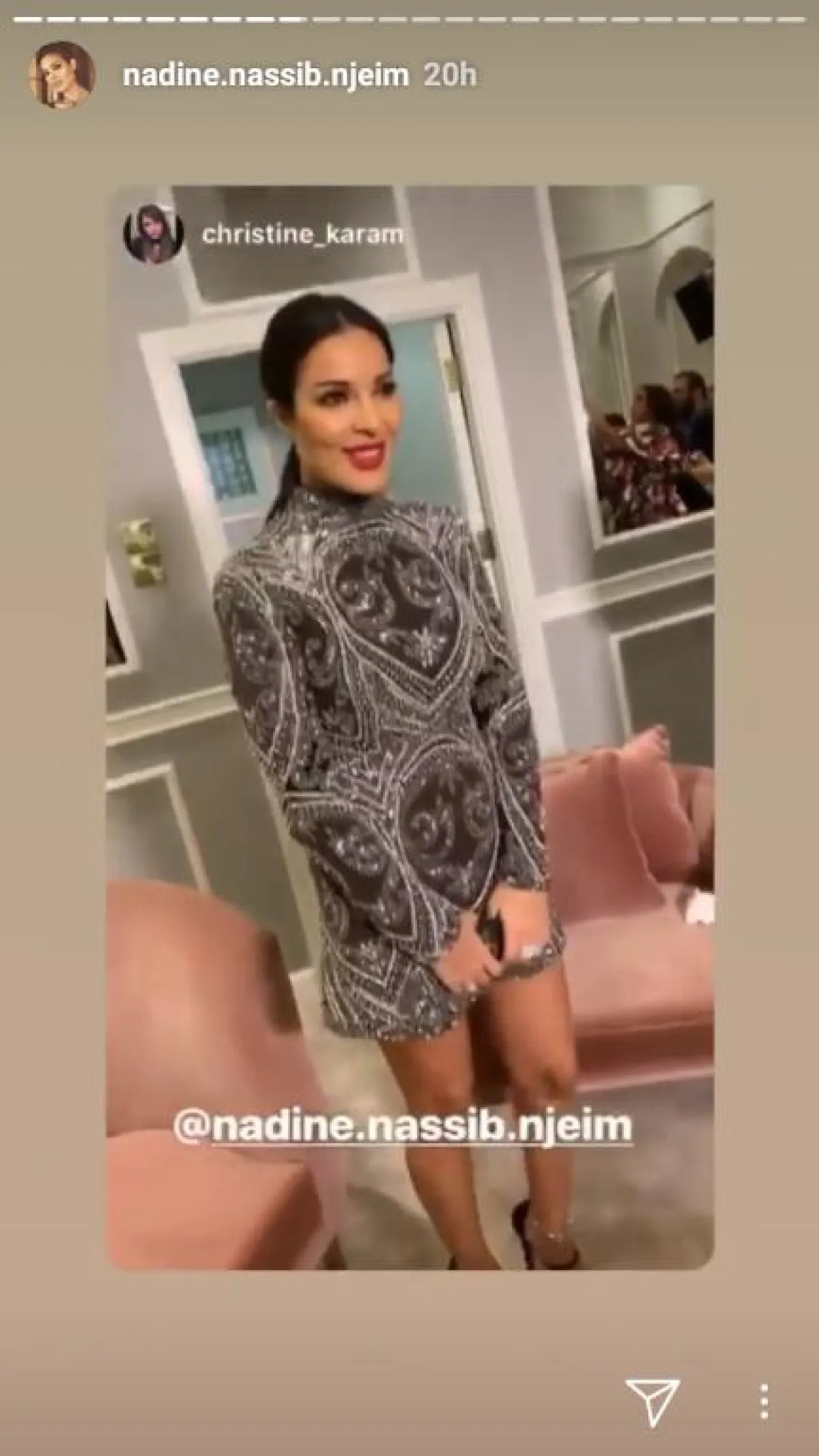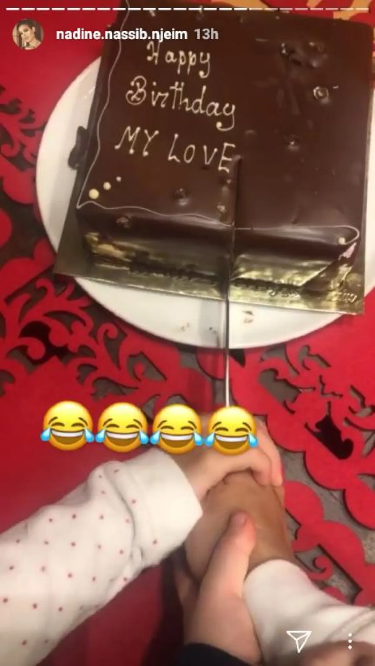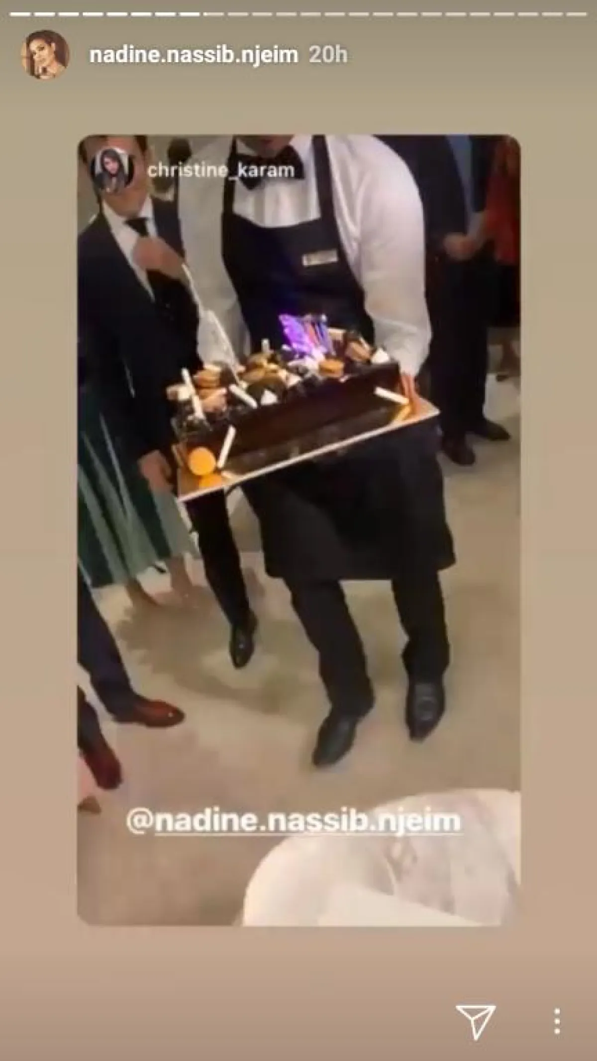ونشرت إحدى الصفحات على "إنستقرام" فيديو من حفل عيد ميلادها في بيتها، وفيديو آخر يجمع بين نادين وإحدى صديقاتها تشكوان فيه من الإكثار من تناول الكاتوه ، حيث قالت صديقة نادين لها" هل تأكلين الكاتو؟"، فردت نادين " صار معنا سكري وبالكاتوه.. العيد مستمر لـ 14 الشهر".