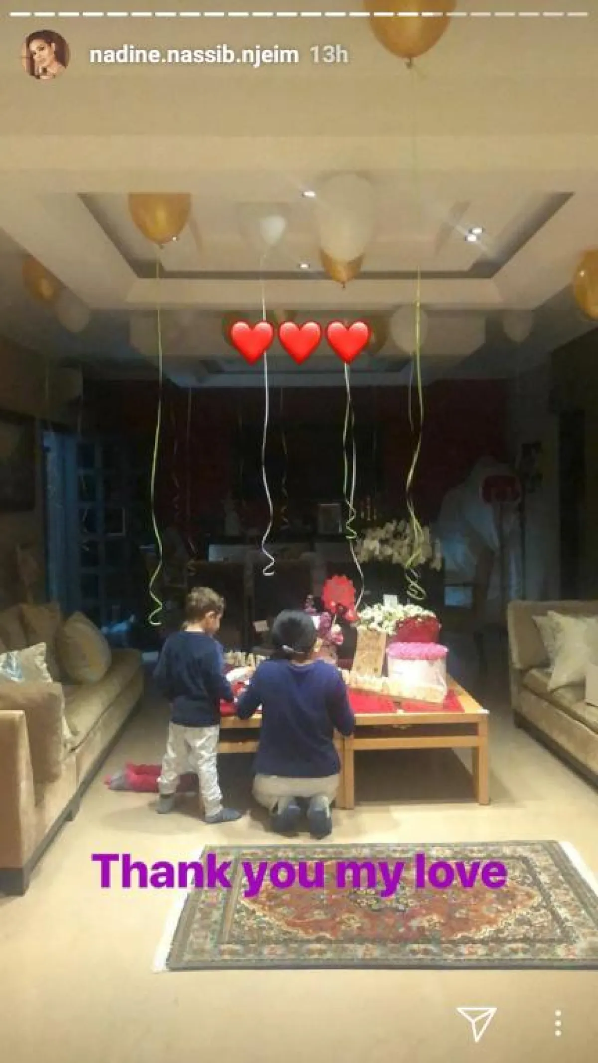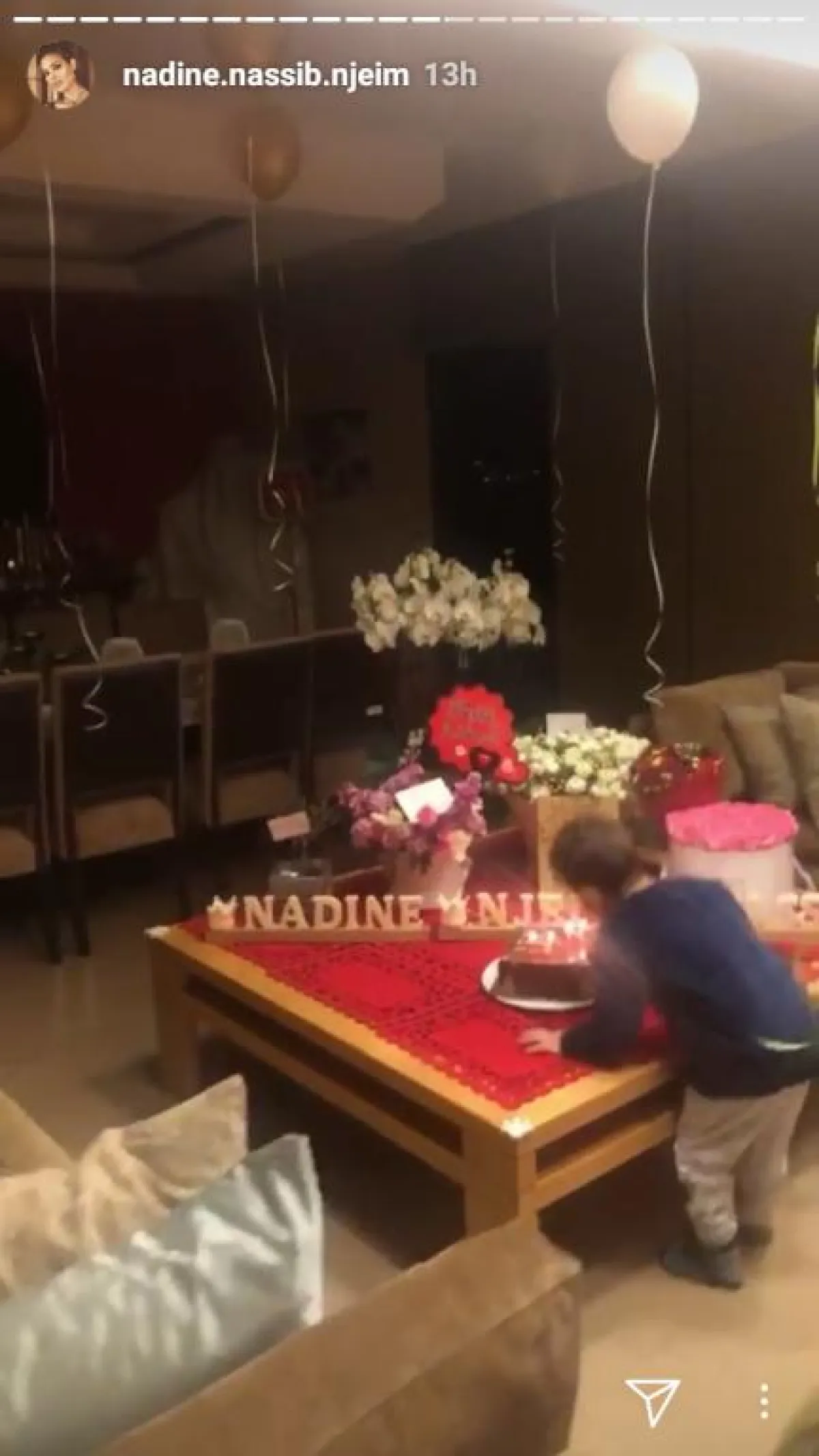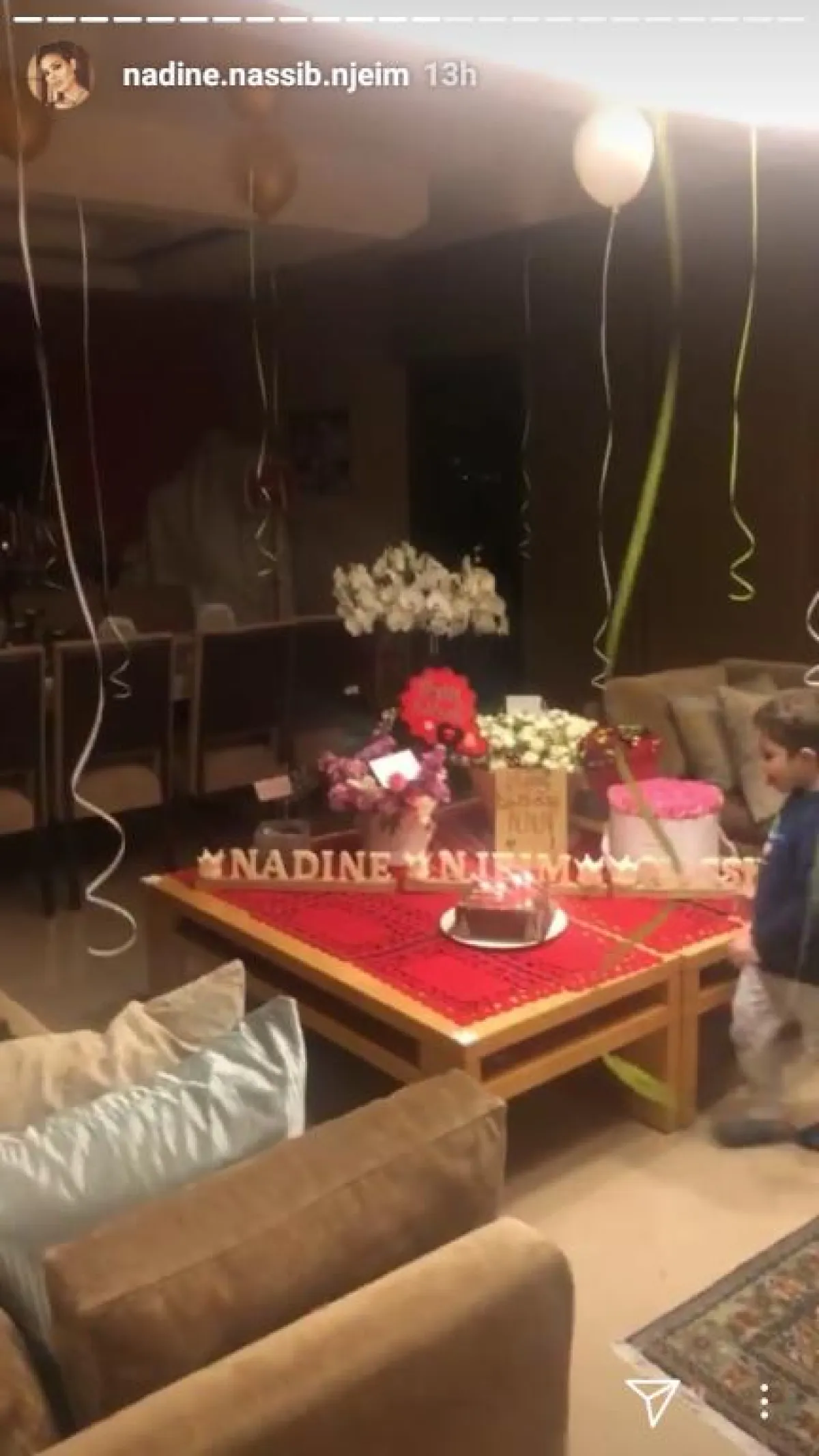 تستمر الاحتفالات بعيد ميلاد الممثلة نادين نجيم، وبعد احتفال فريق عمل مسلسل "خمسة ونص" و "مول دبي" الذي حلّت ضيفة عليه، فوجئت نادين باحتفال آخر أقامه زوجها هادي وولداها جوفياني وهافين بهذه المناسبة، بعد عودتها من دبي.