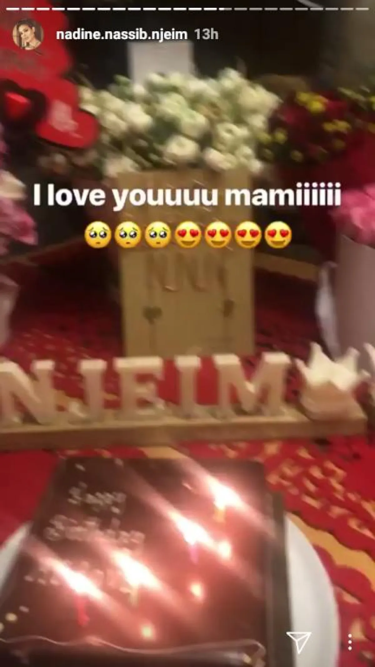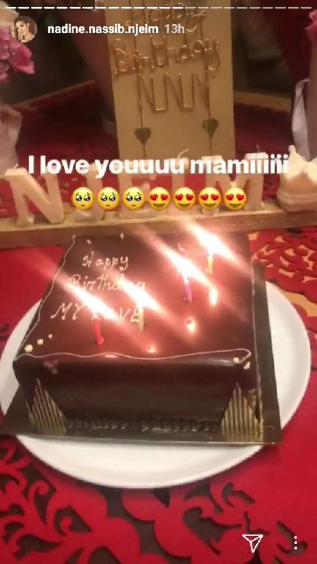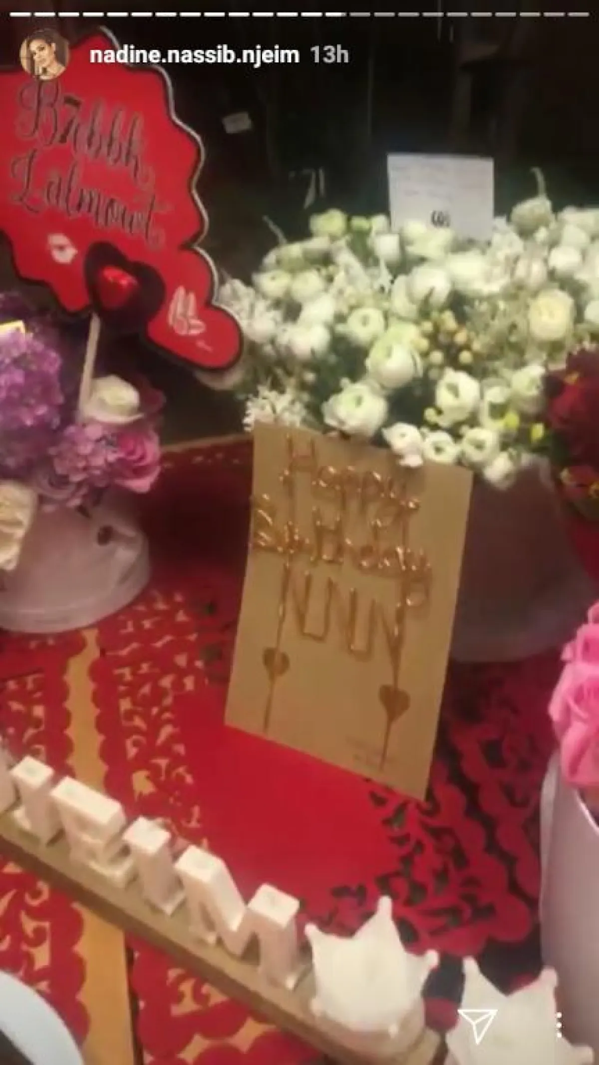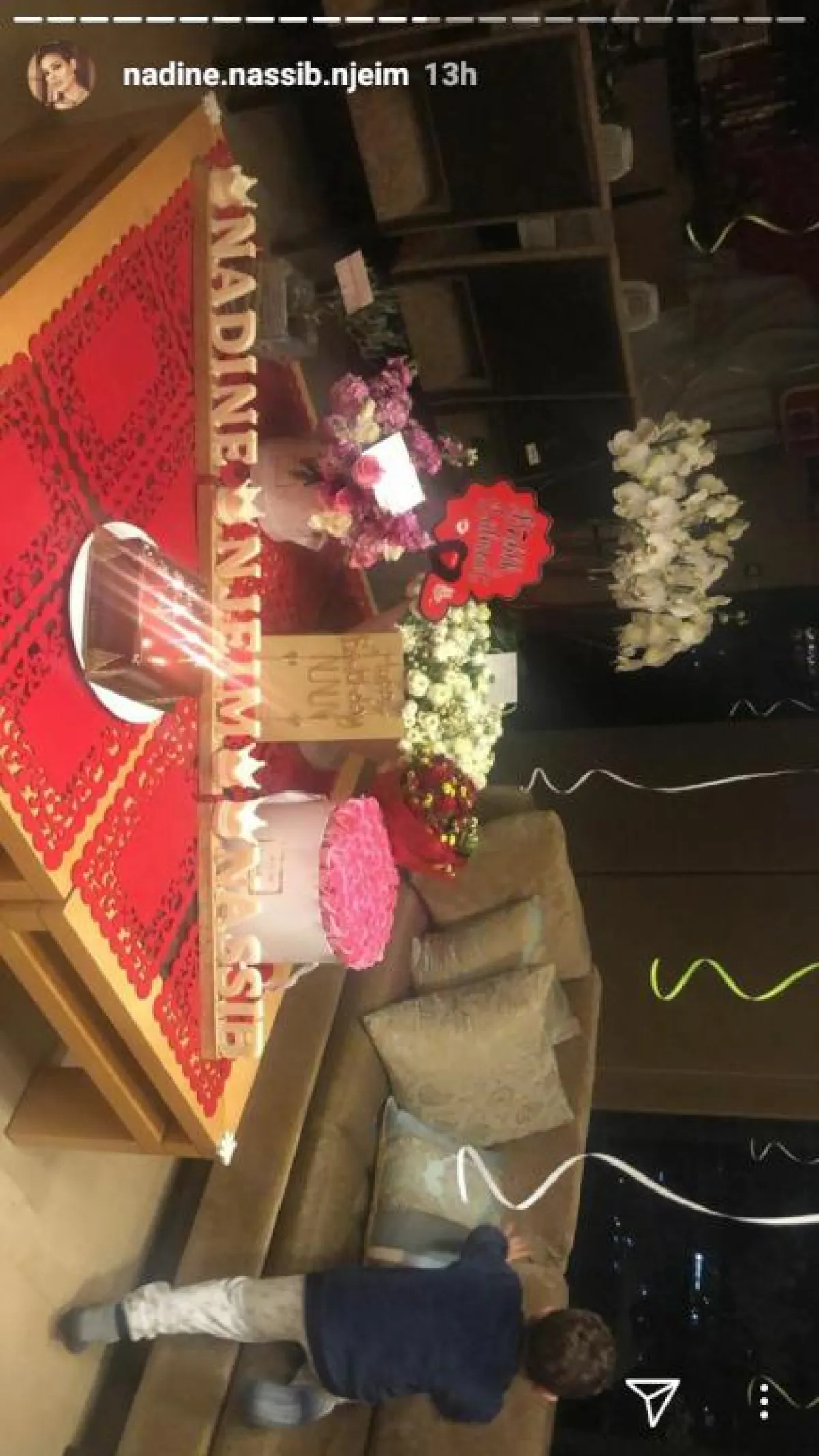 تستمر الاحتفالات بعيد ميلاد الممثلة نادين نجيم، وبعد احتفال فريق عمل مسلسل "خمسة ونص" و "مول دبي" الذي حلّت ضيفة عليه، فوجئت نادين باحتفال آخر أقامه زوجها هادي وولداها جوفياني وهافين بهذه المناسبة، بعد عودتها من دبي.