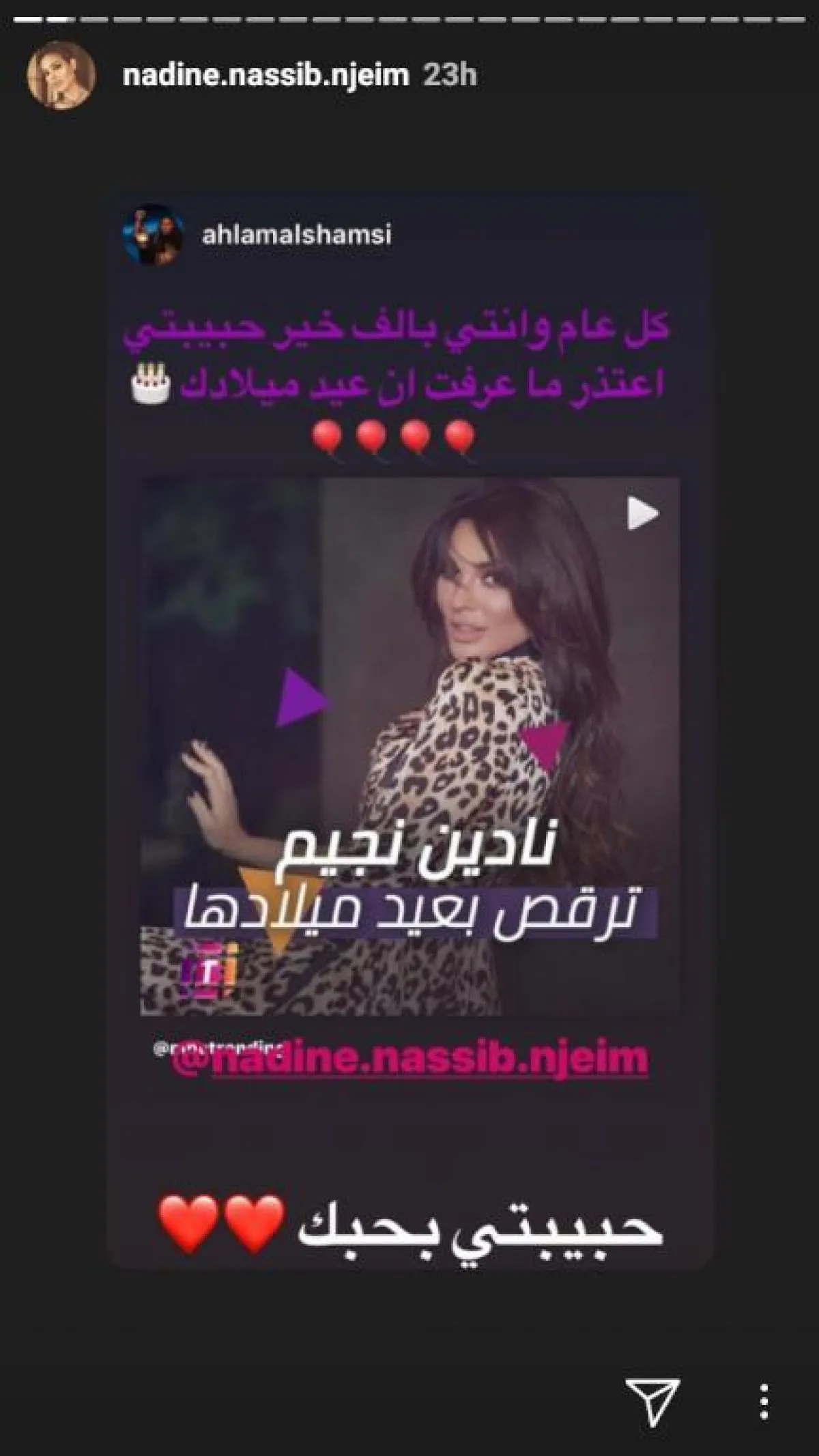 إلى ذلك، نشرت نادين نجيم عبر "إنستا ستوري" صورا من الاحتفال بعيد ميلادها في بيتها، بالإضافة إلى التهاني التي وصلتها من "الفانز" وعدد من المشاهير، من بينهم أحلام و بسمة بوسيل وملكة جمال لبنان السابقة رهف عبد الله.