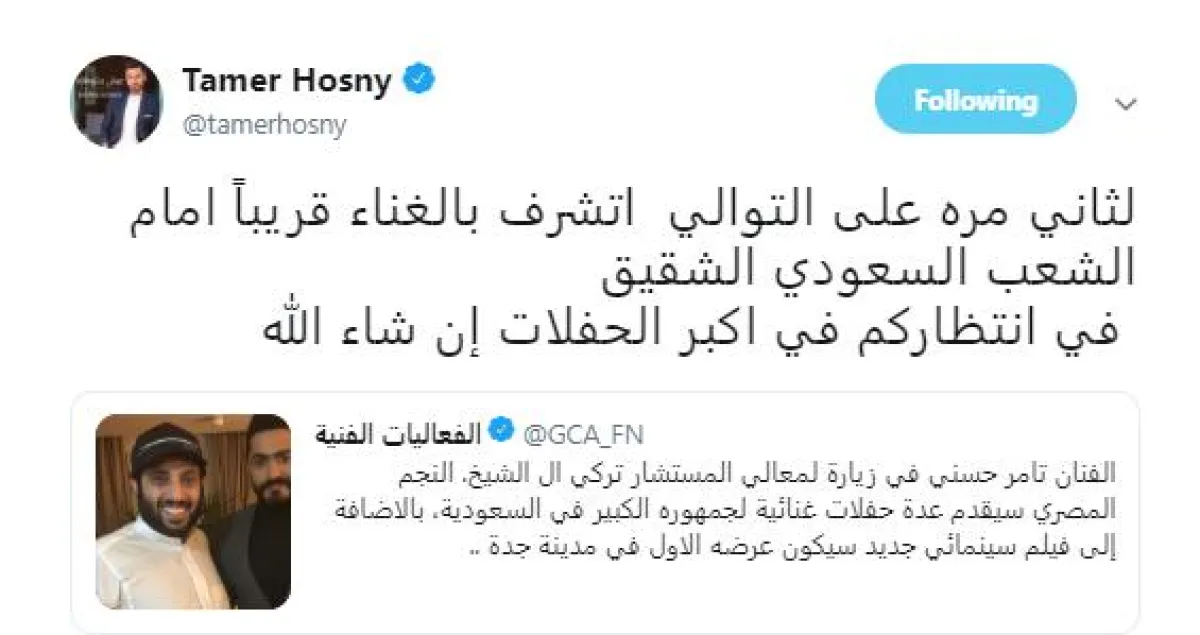 تامر قام بزيارة إلي مقر تواجد المستشار تركي آل شيخ في القاهرة، وغرد عبر تويتر معلقا على صورة من الاجتماع بقوله: لثاني مره على التوالي اتشرف بالغناء قريباً أمام الشعب السعودي الشقيق.. في انتظاركم في أكبر الحفلات إن شاء الله.