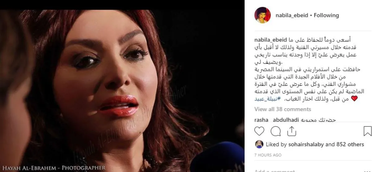 نبيلة تلقت العديد من الاستفسارات حول خطوتها الفنية المقبلة، كما راجت مؤخرا شائعات تؤكد تعاقدها لتقديم دور "صغير" في فيلم جديد، وقررت الرد على الجميع في رسالة واحدة أطلقتها عبر حسابها بموقع إنستقرام قالت فيها: أسعى دومًا للحفاظ على ما قدمته خلال مسيرتي الفنية ولذلك لا أقبل بأي عمل يعرض عليّ إلا إذا وجدته يناسب تاريخي ويضيف لي.