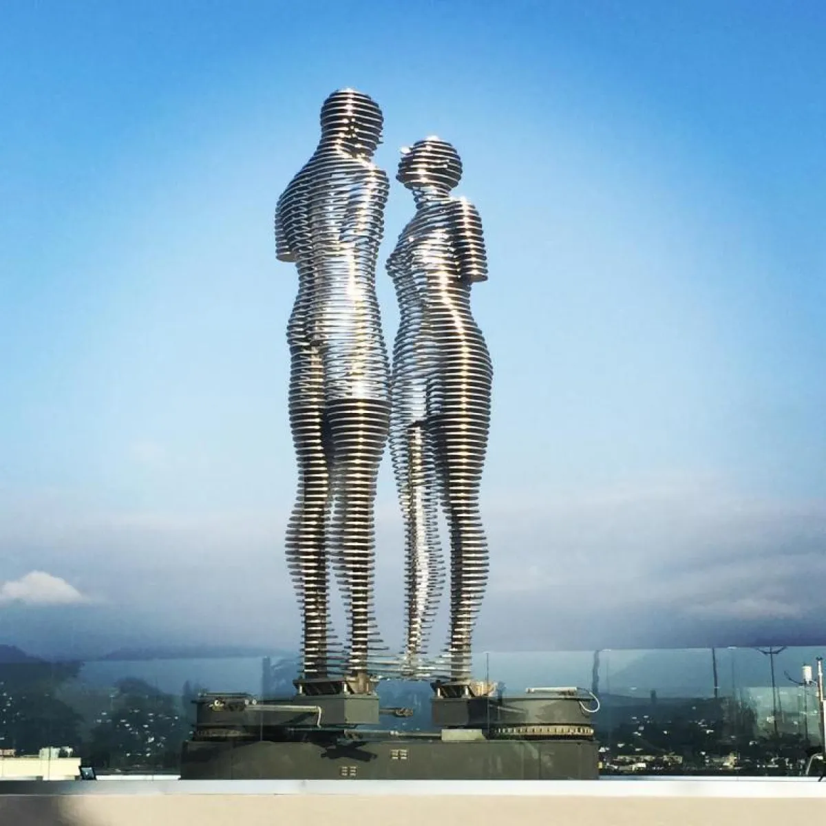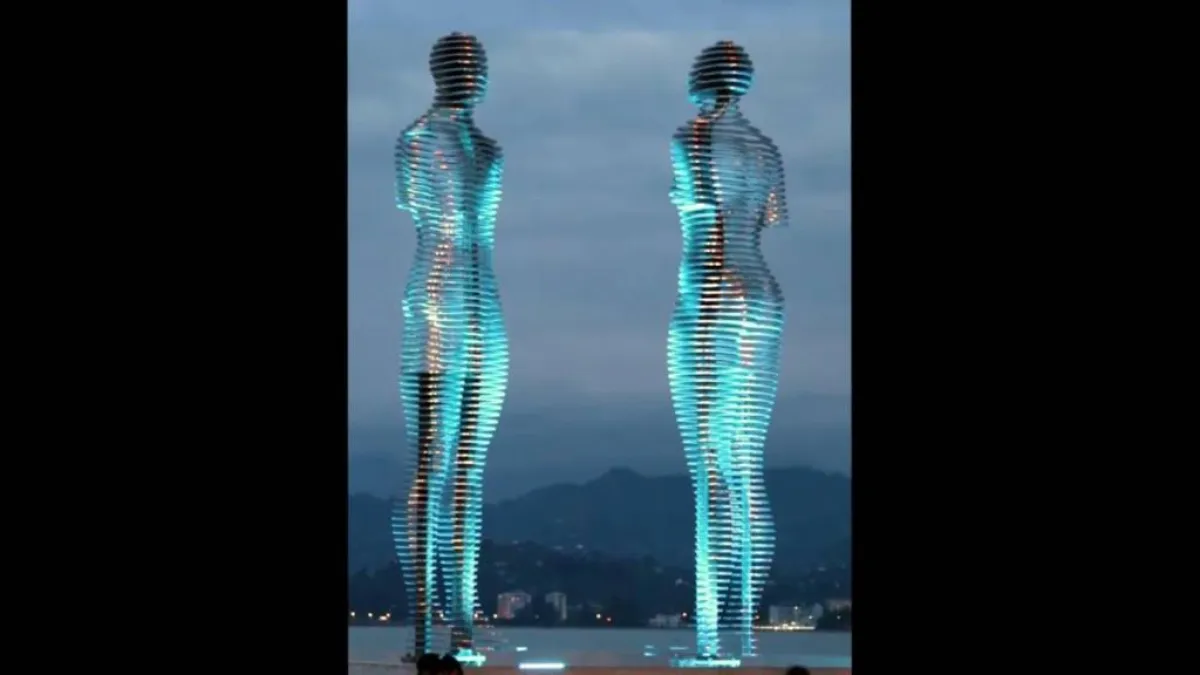 تمثال «علي ونينو»، تمثال يتحرك بشكل دائري؛ فيتقابلان ثم يتعانقان ليتحد جسداهما ويصبحا شخصاً واحداً لثوانٍ قليلة، ثم يمر كل منهما مكملاً طريقه بمفرده، أمام تجمهر السياح حولهما محدقين النظر في كل حركة يتحركها التمثال؛ من أجل التقاط صور توثق اللحظات التي يتحد فيها التمثالان لينفصلا.