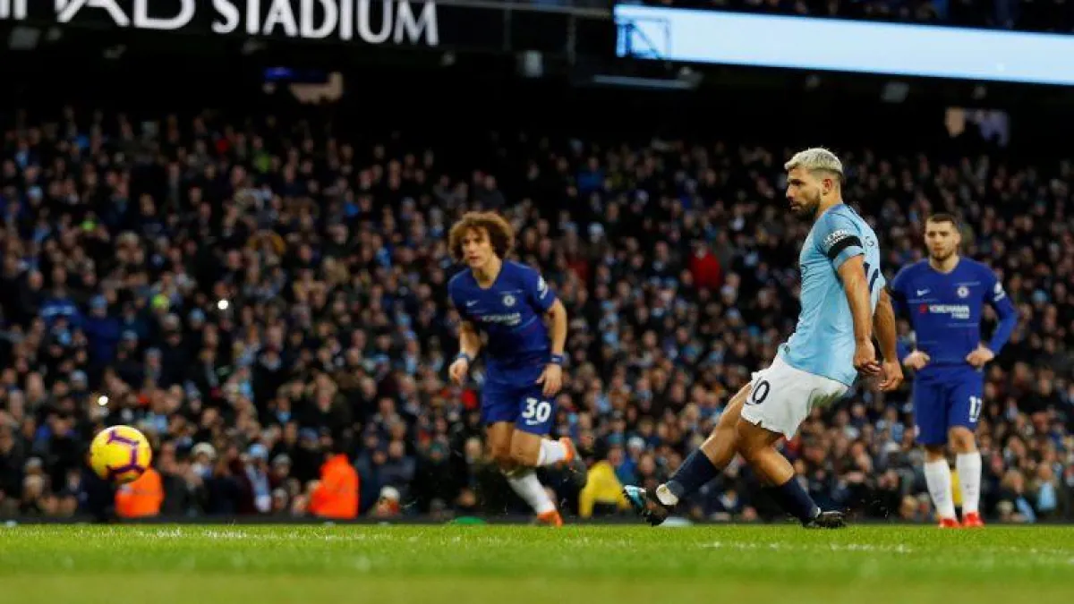 أغويرو خلال تسجيله هدف الهاتريك من ضربة جزاء