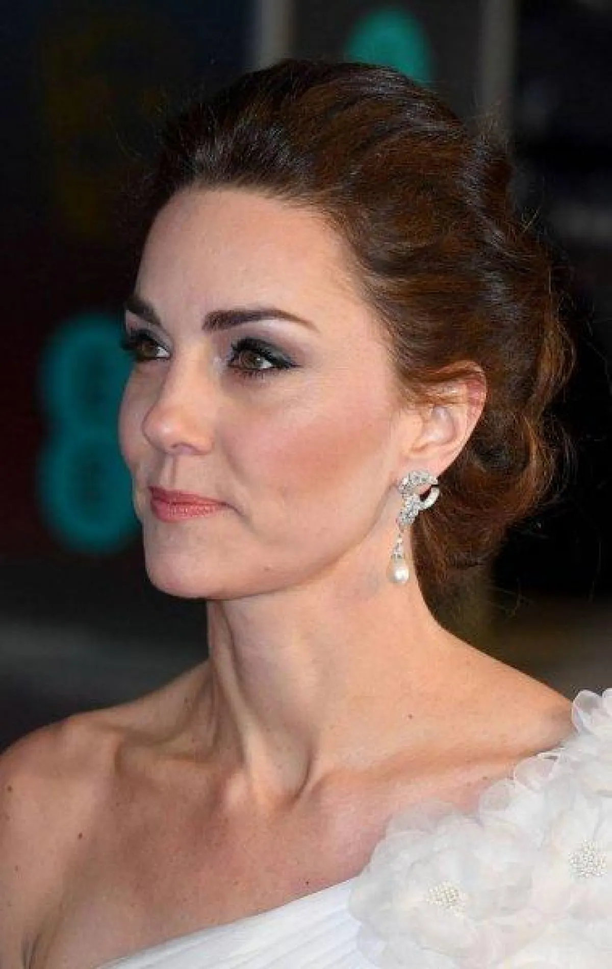 دوقة كامبريج كيت ميدلتون ظهرت بإطلالة ملكية جمعت الرقي والأناقة والهدوء في الوقت نفسه، حيث اعتمدت مكياج العيون المظلل باللون الأخضر الهادئ، وأحمر الشفاه الوردي، وأضاءت وجنتيها بالبلاش الوردي الخفيف. ميدلتون اختارت أيضاً تسريحة الشينيون، التي تعتمدها في غالبية إطلالاتها.