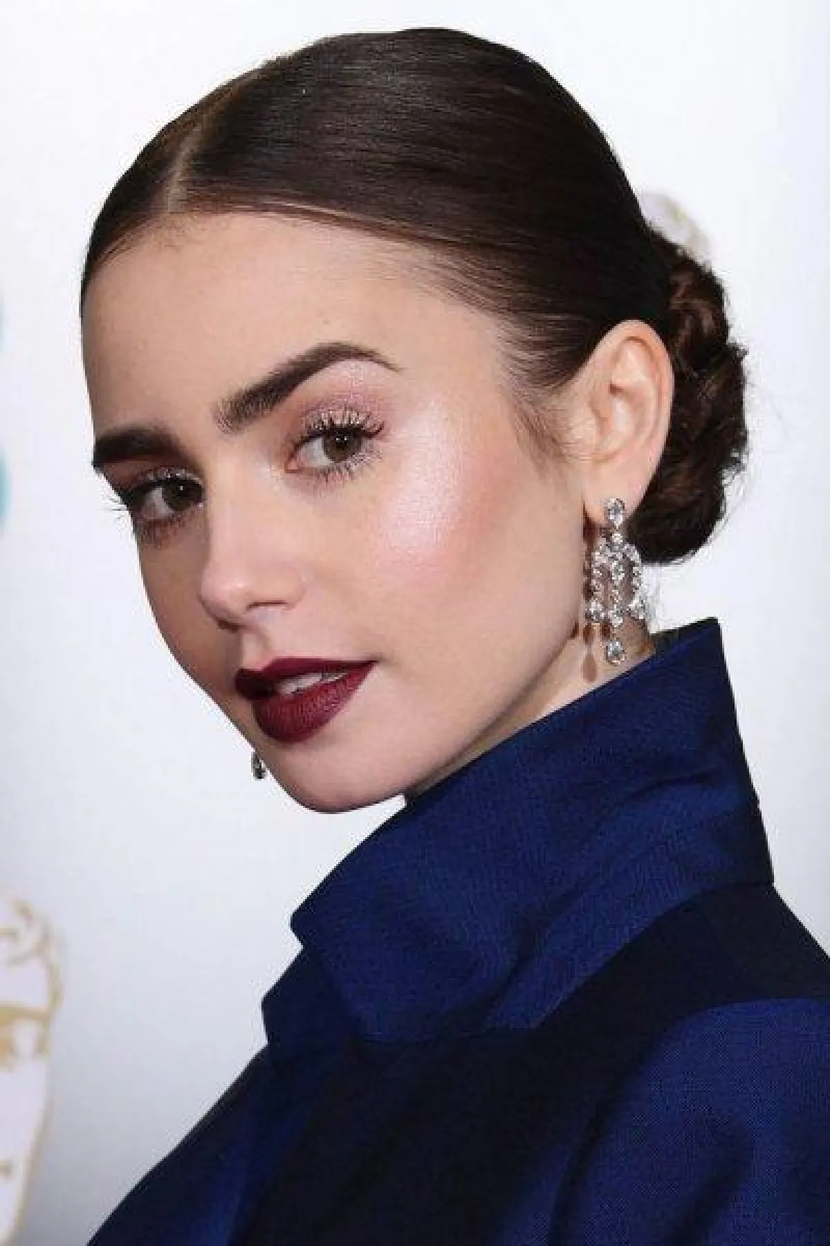 النجمة ليلي كولينز Lily Colins، تألقت بمكياج مفعم بالأنوثة، ارتكز على أحمر الشفاه الخمري القوي، وظلال العيون الخفيفة والهادئة. في المقابل، اعتمدت تسريحة الكعكة المنخفضة مع الغرة النصفية المشدودة الى الخلف، مما سلط الضوء على جمال ملامح وجهها ومنحها إطلالة عصرية غاية في الأنوثة والجمال.