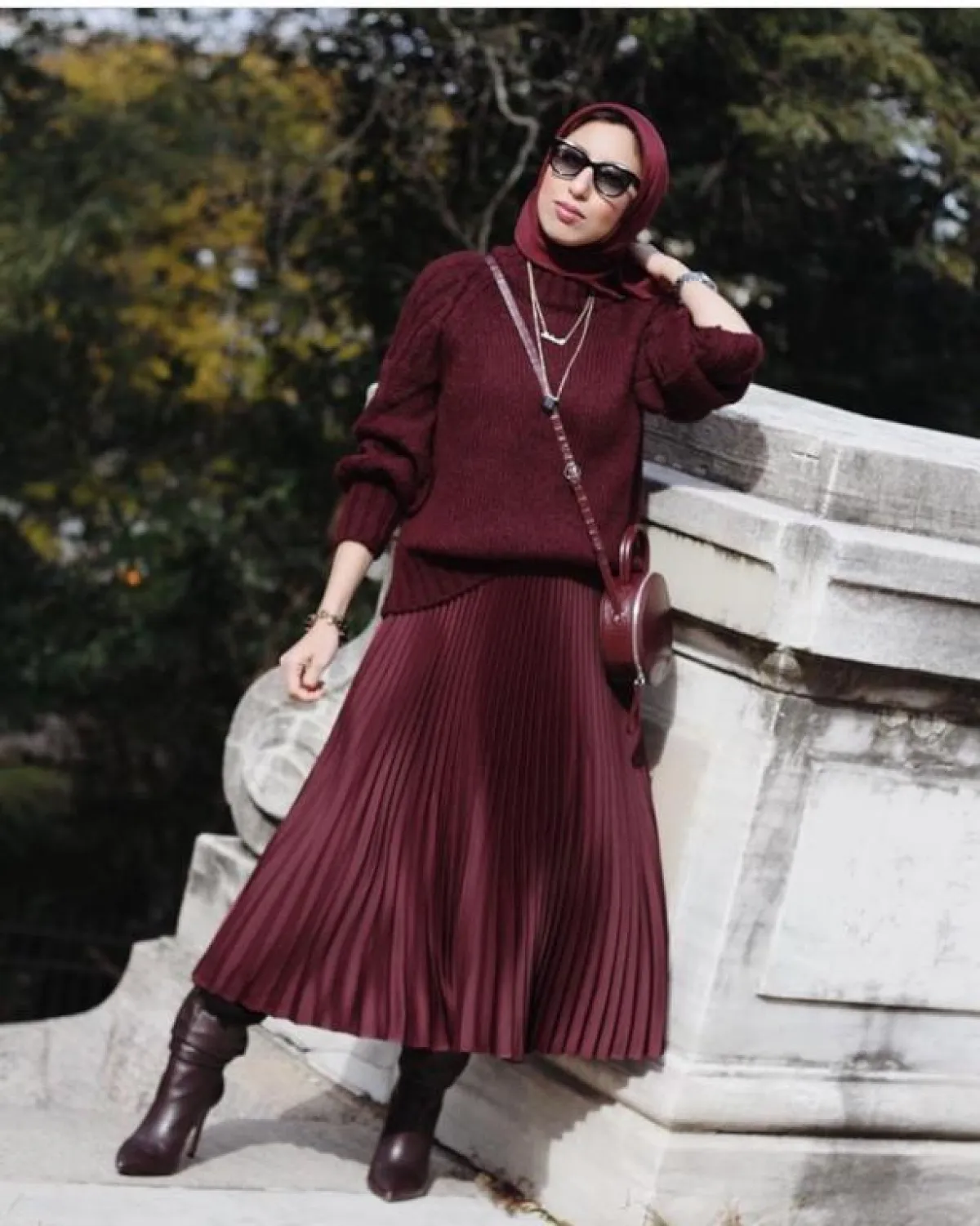 لفتنا كذلك اختيارها للـ تنانير، فبالرغم من أنّ ميلانيا تفضل أكثر البناطيل، إلا أنها استطاعت اعتماد صيحة التنانير بشكل عصري ولافت، بتطبيق اللوك الحيادي، بـ التنورة البليسيه المكسرة، مع كنزة صوف من لون التنورة نفسه بالأحمر العنبي، حتى بوت الساق والشنطة جاء من اللون نفسه، خيار جريء ولكنه بدا متناسقًا مع ضوء النهار.
