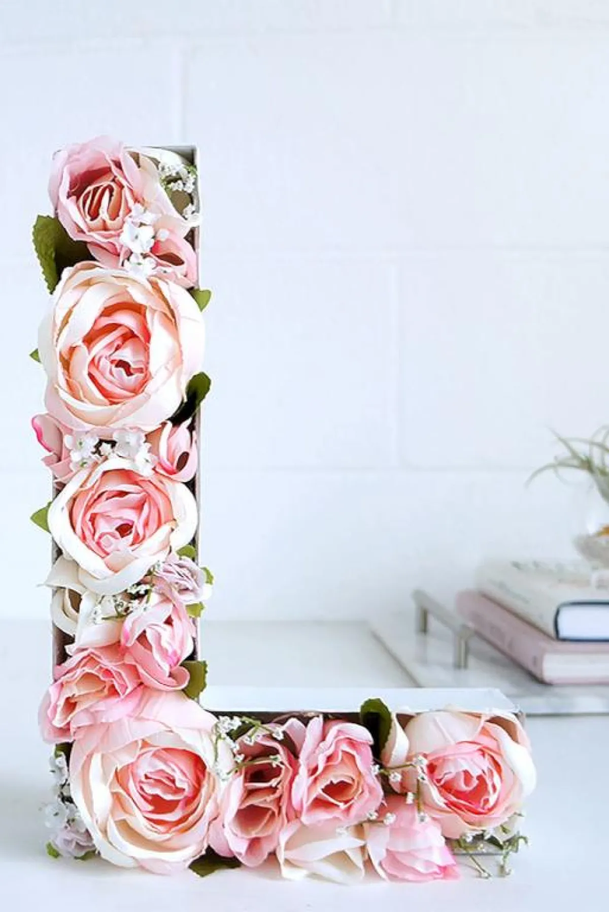 2. يُعمل تكوين من علب الكرتون، على شكل حرف الحاء أوL اللاتيني أو الحرف الأوَّل من اسم الحبيب، ثمَّ توضع الزهور داخل التكوين، أو يُغلَّف بخيوط مُلوَّنة.