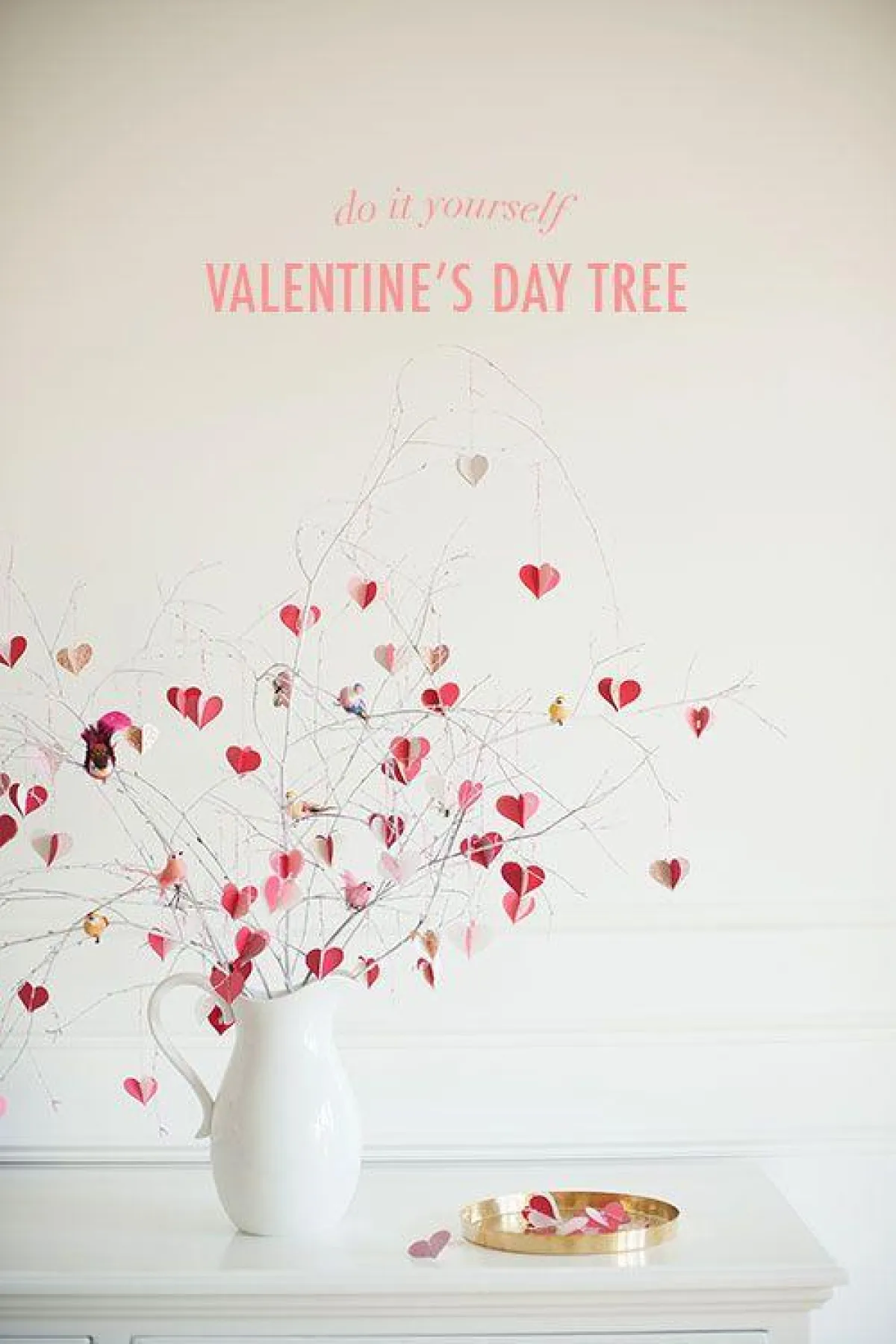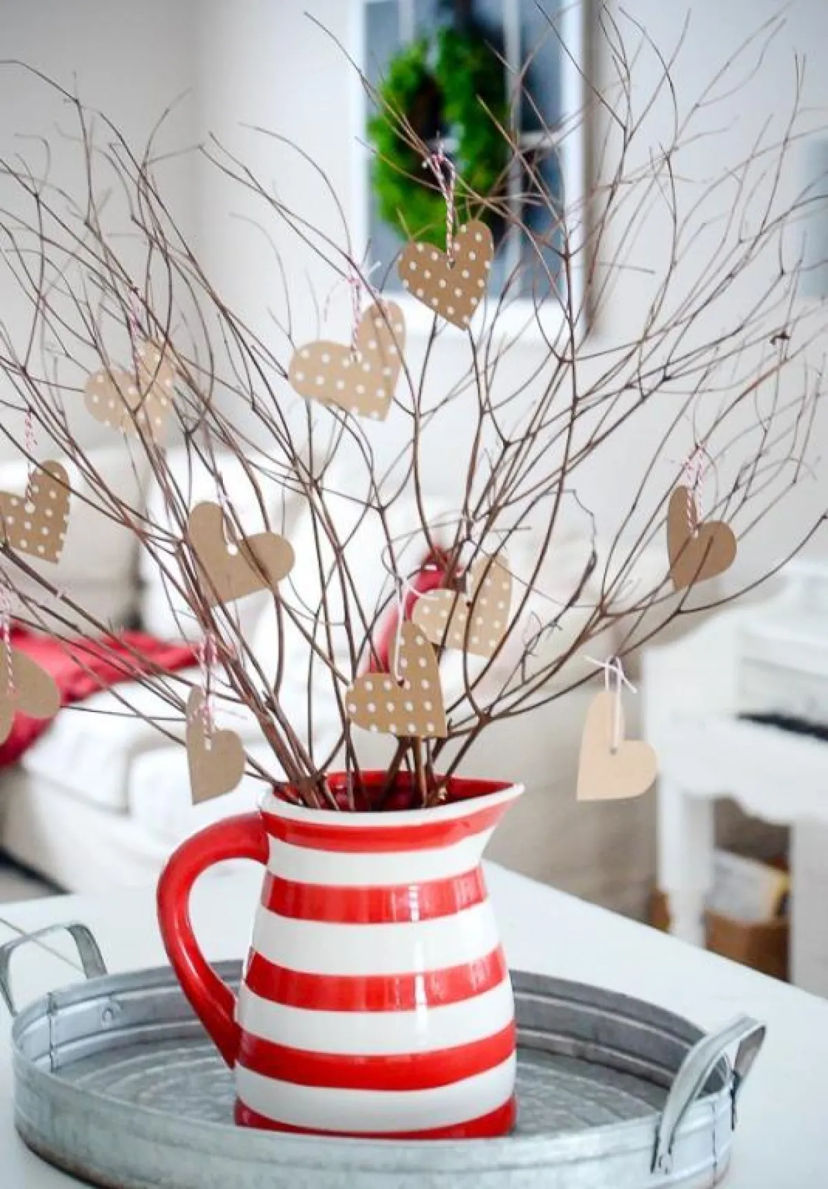 7. تُطلى أغصان النباتات اليابسة باللون الأبيض، وتُزيَّن بالقلوب والحروف والعبارات الرومانسية.