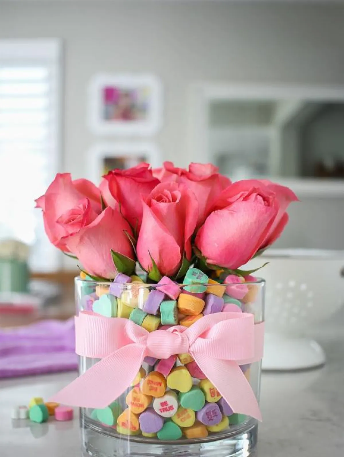 5. يُملأ إناء زجاج عميق بالحلوى والزهور معًا.