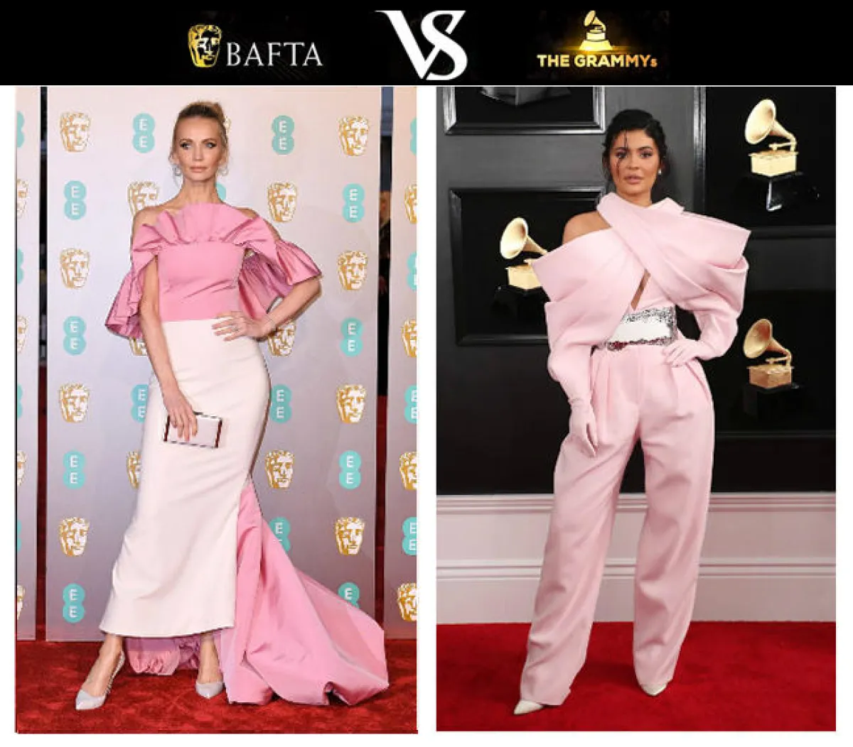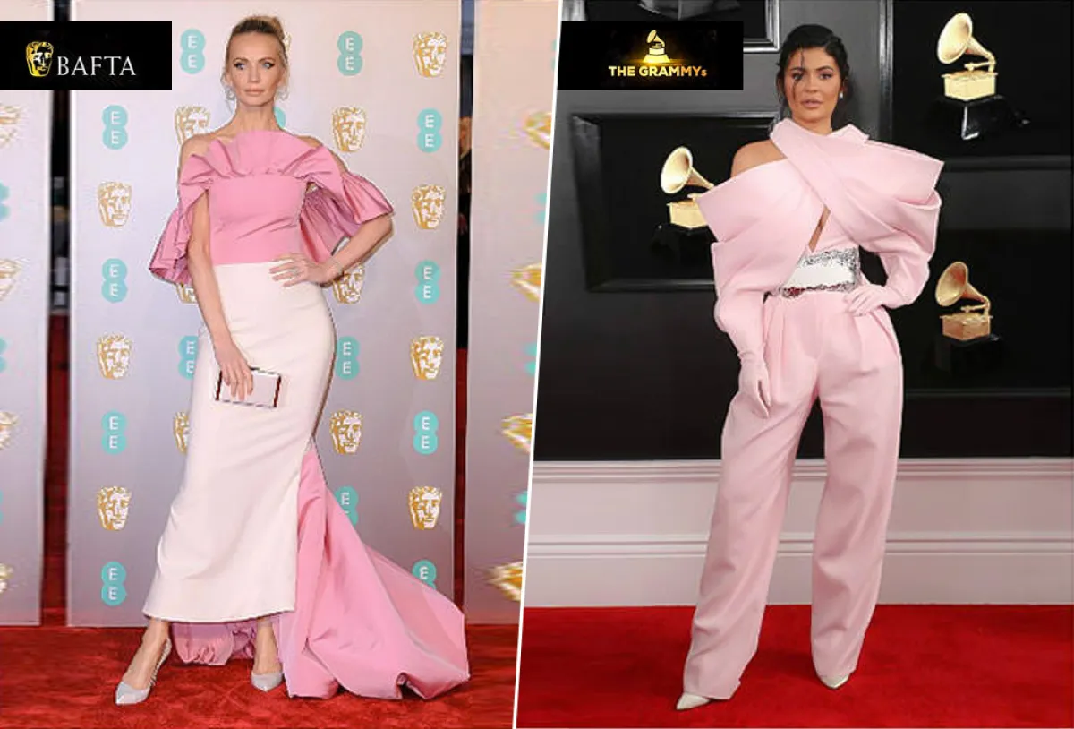 شاهدنا كايلي جينر Kylie Jenner في حفل الغرامي، وقد اختارت جمبسوت باللون الزهري الفاتح من مجموعة “بالمان كوتور” Balmain Couture بتصميم لافت، ولاسيما من ناحية قصة الكتف، وبالمقابل شاهدنا الممثلة الروسية “تاتيانا كورساكوفا” Tatina Korsakova في حفل البافتا Bafta وقد اختارت فستانًا باللون الزهري بتصميم لافت مزين بالكشكش باللون الزهري. وقد بدت الاطلالتان نوعًا ما متشابهتين.