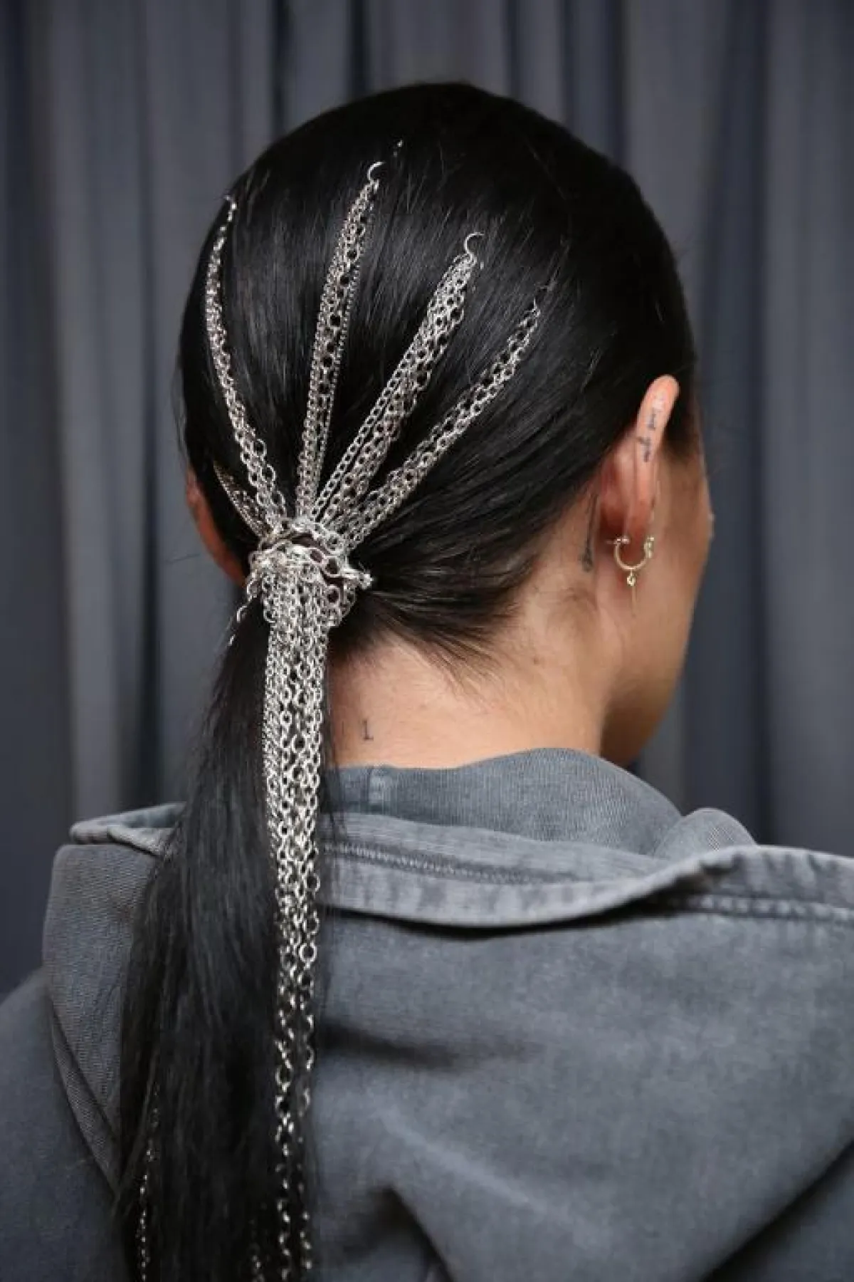 إنها نسخة عصرية ومبتكرة من تسريحة ذيل الحصان المنخفضة، أطلّت بها عارضات دار Christian Siriano، حيث تم تزيين الشعر بسلاسل معدنية فضية، ممتدة من وسط الشعر وملفوفة حول الشعر المربوط على شكل ذيل الحصان.