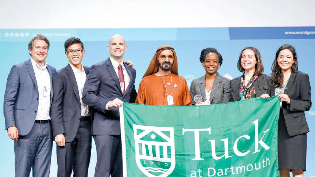 كرّم الشيخ محمد بن راشد آل مكتوم، نائب رئيس الدولة رئيس مجلس الوزراء حاكم دبي، فريق كلية «تاك» للأعمال من الولايات المتحدة الأميركية، الفائز بتحدي الجامعات العالمي لاستشراف حكومات المستقبل في الدورة الثالثة، وذلك خلال حفل تكريم الفائزين بجوائز الدورة السنوية السابعة من القمة العالمية للحكومات، وبحضور الشيخ حمدان بن محمد بن راشد آل مكتوم، ولي عهد دبي.