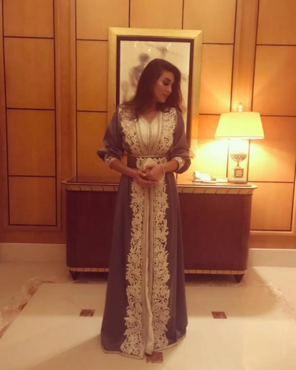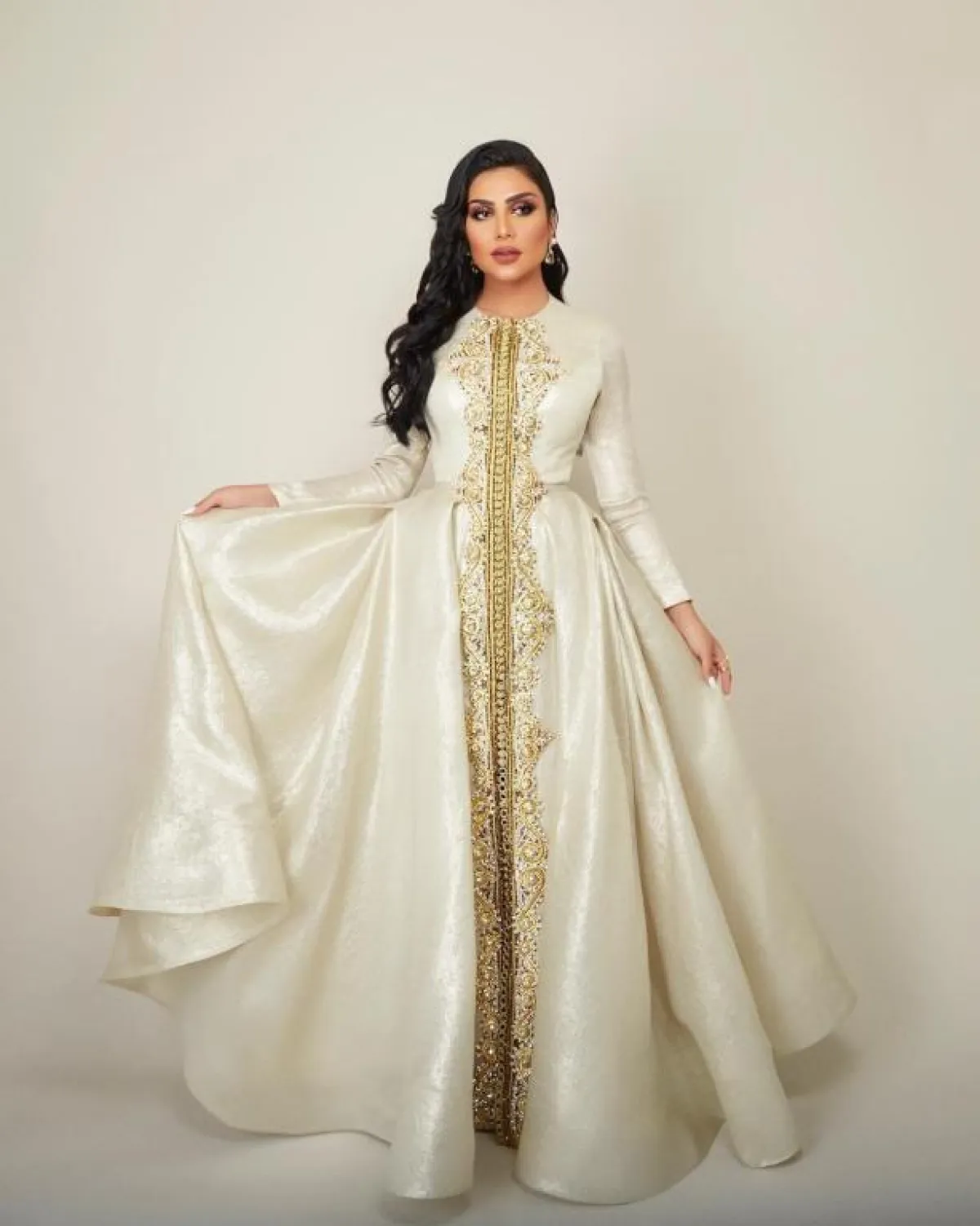 تعشق أمل العوضي الاطلالات الشرقية، وكثيرًا ما تختارها في مختلف المناسبات ومنها هذه الاطلالة في القفطان المغربي باللون اللؤلؤي المطرز بخيوط ذهبية، والذي بدت فيه مثل الأميرات، ولاسيما من ناحية تصميمة اللافت المحدد الخصر مع التنورة الكبيرة.