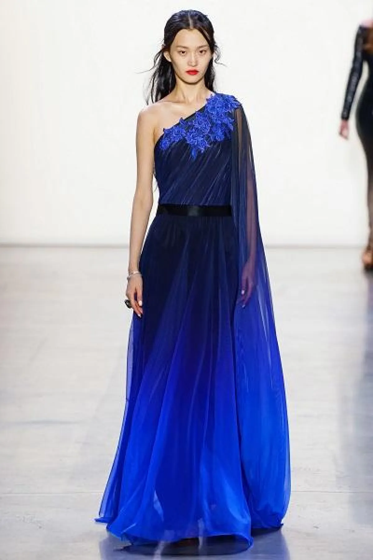 كذلك، فقد لفتتنا الفساتين بالكشاكش على منصّة كريستيان سيريانو Christian Siriano؛ من خلال هذا الفستان المصمم من قماش التفتة الفخم باللون النيلي الملكي.