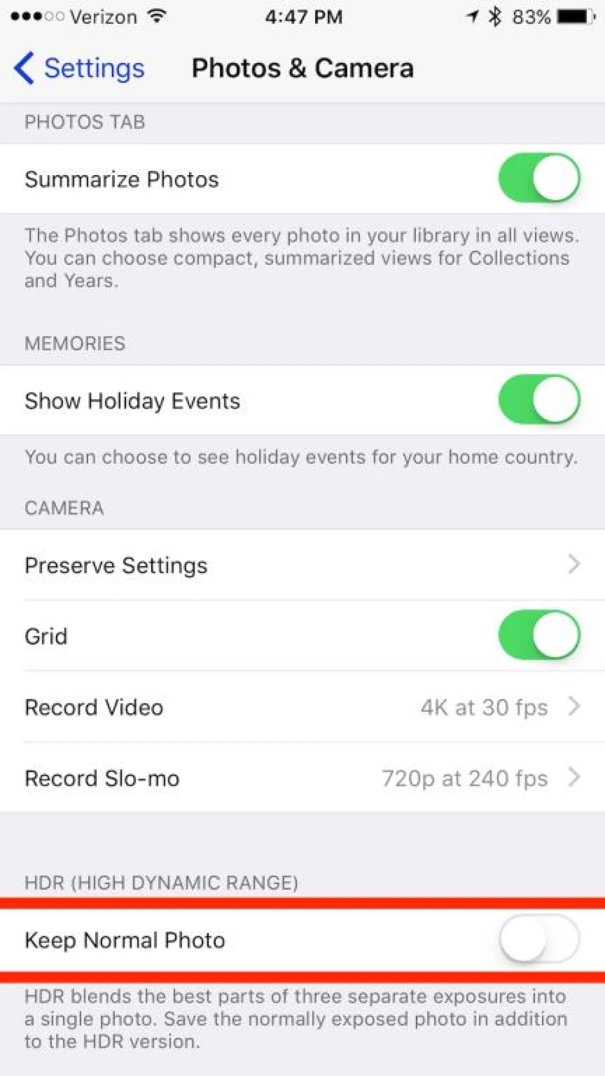 هناك طريقة أخرى لمنع تطبيق الكاميرا من استخدام مساحة تخزين كبيرة جدًا عن طريق إيقاف الإعداد الذي يؤدي إلى بقاء الصور المكررة على iPhone في وضع HDR افتراضيًا، يتم تعيين إعدادات iPhone على «الاحتفاظ بالصورة العادية» ضمن قسم HDR -، مما يعني أنك تقومين بحفظ الصورة المعروضة بشكل طبيعي بالإضافة إلى إصدار HDR ويمكنك إيقافها من خلال إيقاف تشغيل هذه الميزة، وستحتفظين فقط بإصدار HDR للصورة.