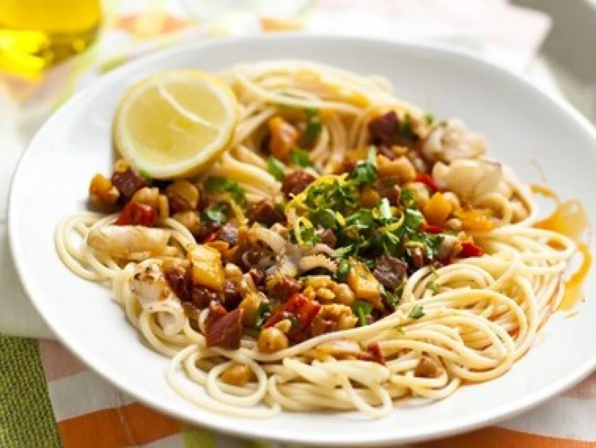4 -يضاف مزيج الروبيان وصلصة البندورة فوق "السباغتي"، مع الخلط. ويزيّن الطبق بالبقدونس وجبنة "البارميزان"، ويقدّم ساخناً.
