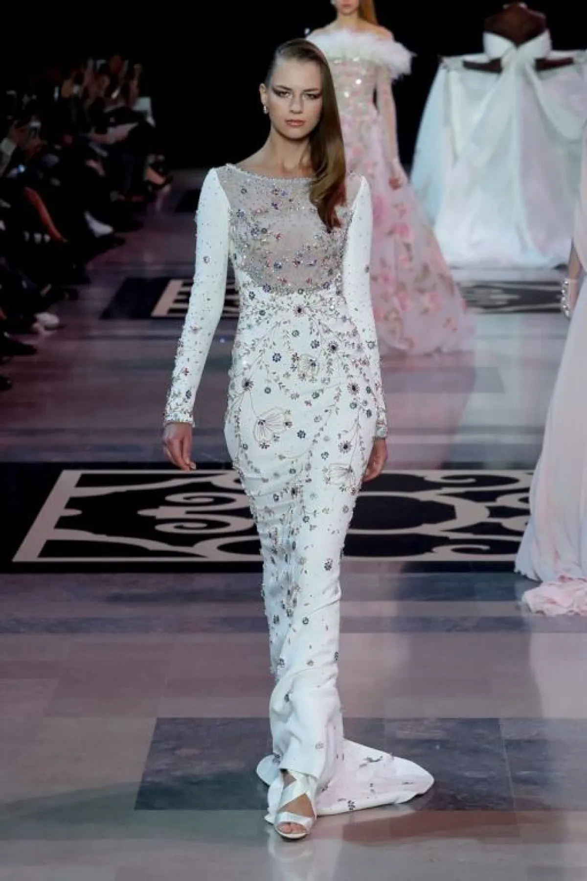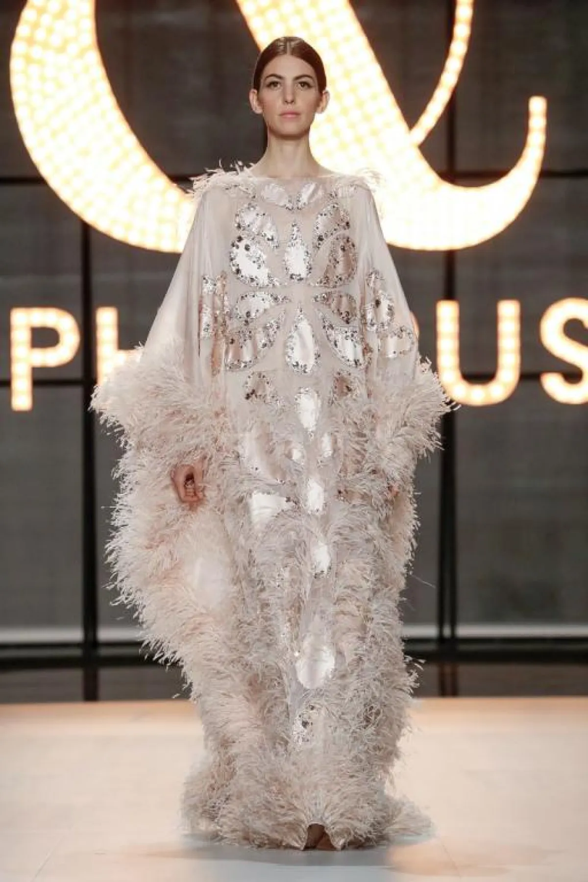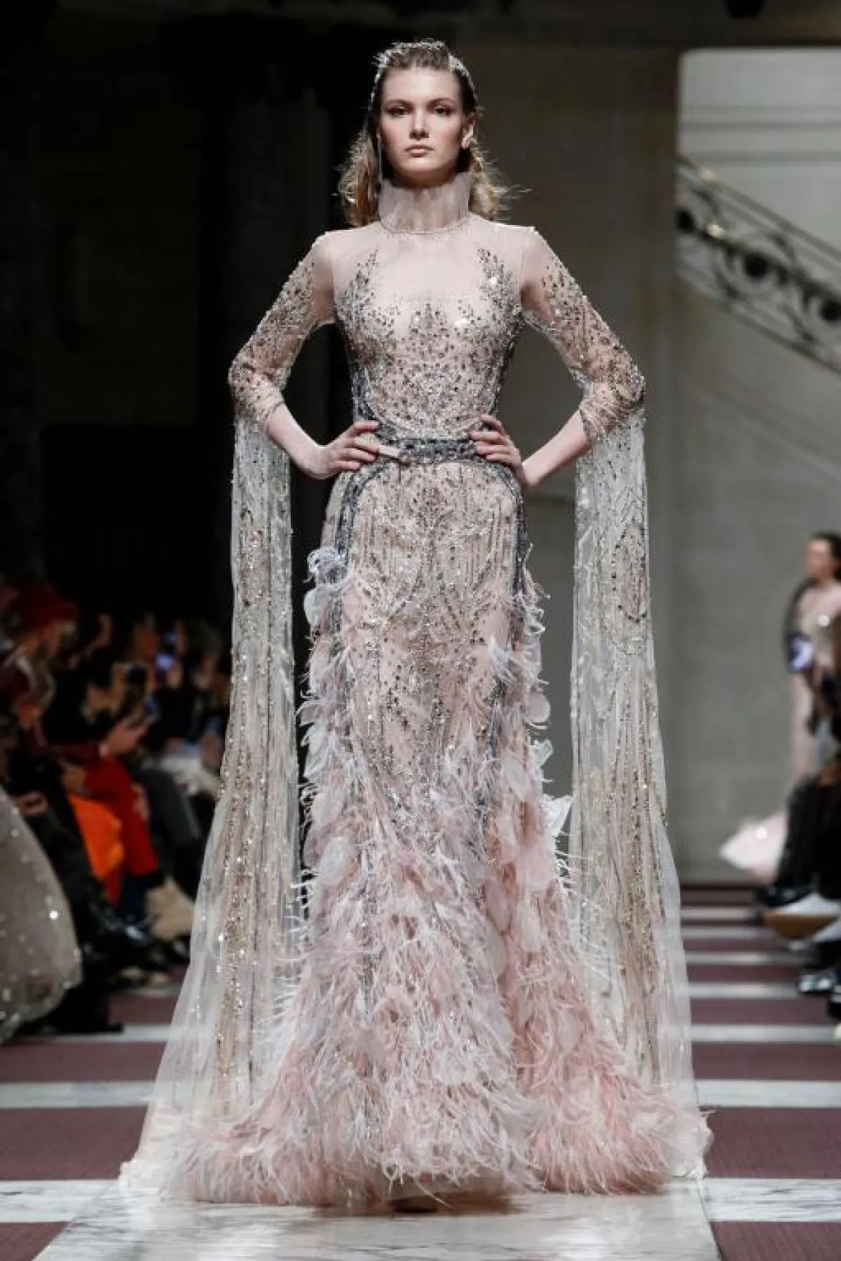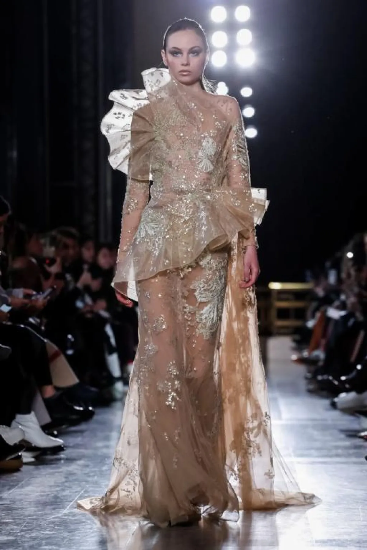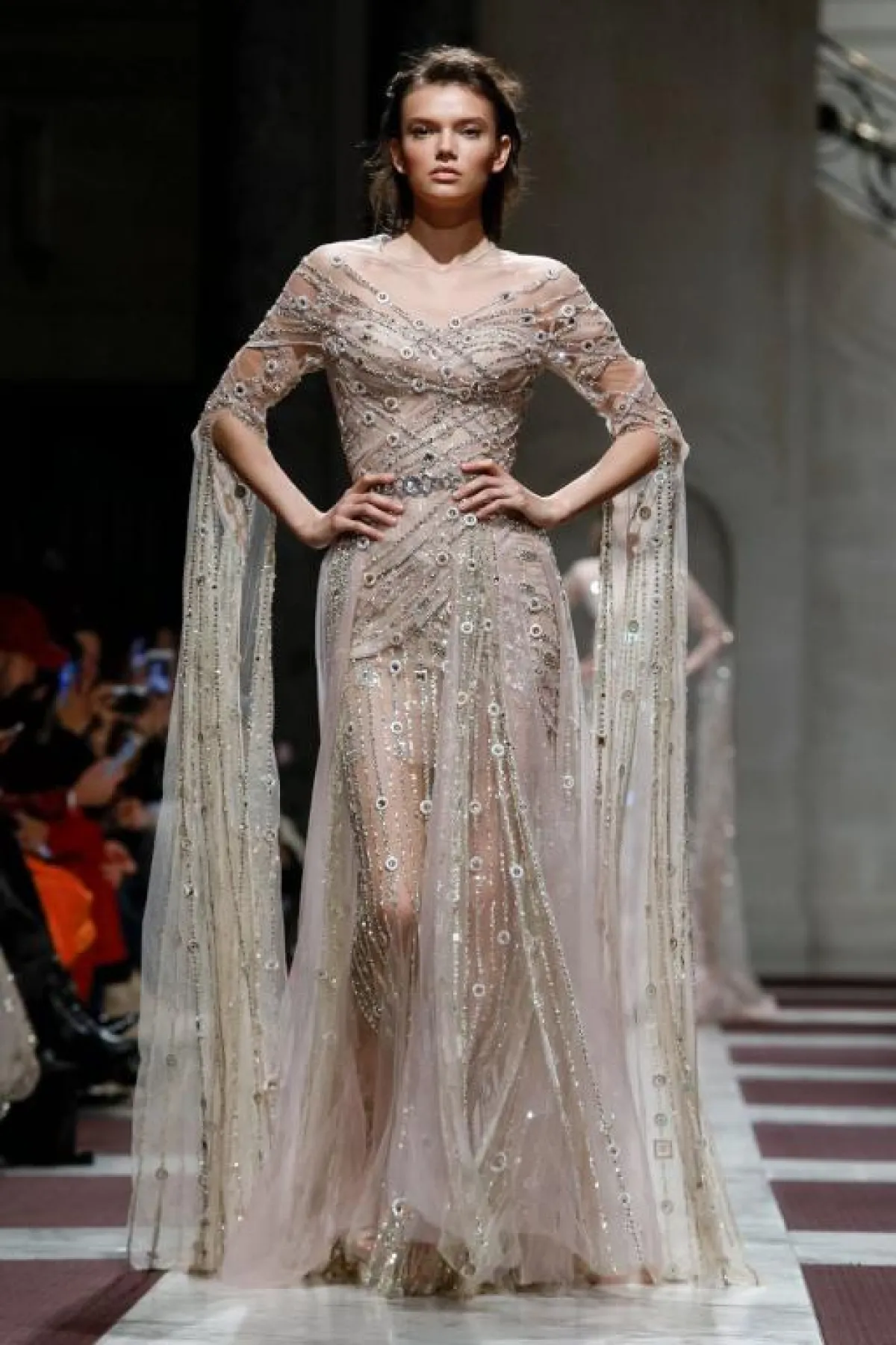 *اختاري فستانًا باللون البيج، مطرزًا ومجسّمًا، إلى جانب وجود طبقة من الشيفون من وسطه إلى أسفله، فهو يعطيكِ فخامة الشكل.