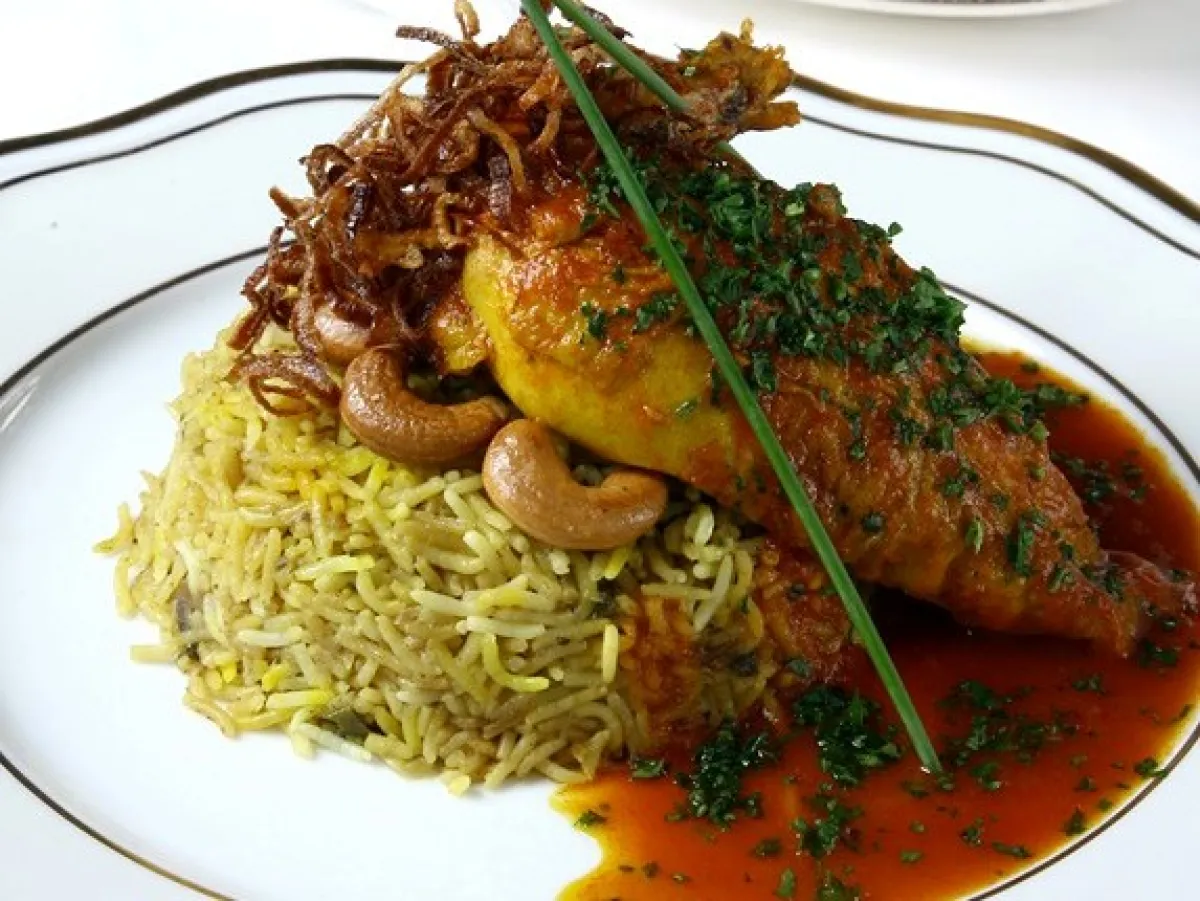 4- يسكب في طبق التقديم، ويزيّن بالكاجو والصنوبر والبقدونس وشرائح البصل المقلية.