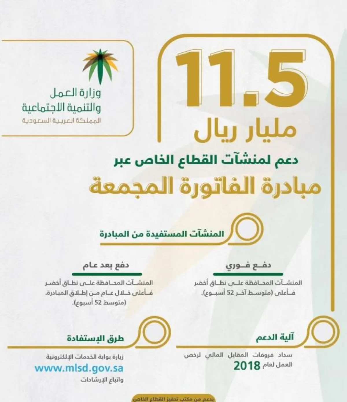 يذكر أن المقام السامي كان قد وافق قبل أيام على "مبادرة الفاتورة المجمعة"، دعماً للمنشآت الملتزمة بالتوطين عبر تخصيص 11.5 مليار لسداد فروقات المقابل المالي لعام 2018م.