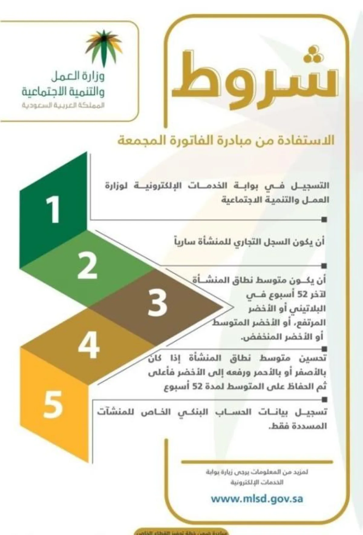 حددت وزارة العمل والتنمية الاجتماعية، 5 شروط للاستفادة من "مبادرة الفاتورة المجمعة"، إذ تضمنت، سريان السجل التجاري، والتزام المنشأة بمتوسط نطاق أخضر فأعلى لآخر 12 شهراً.