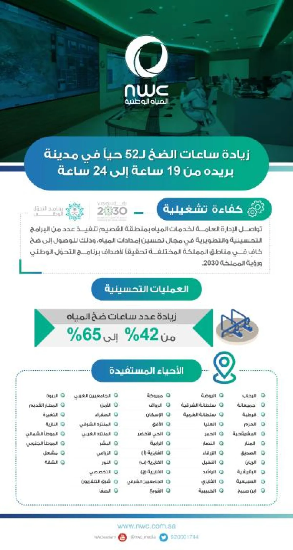 نفذ قطاع توزيع المياه ممثلاً بالإدارة العامة لخدمات المياه بمنطقة القصيم بنجاح خطة رفع الكفاءة التشغيلية لعدد 52 حياً في مدينة بريدة لإيصال الضخ الكافي في شبكات المياه من 19 ساعة إلى 24 ساعة.