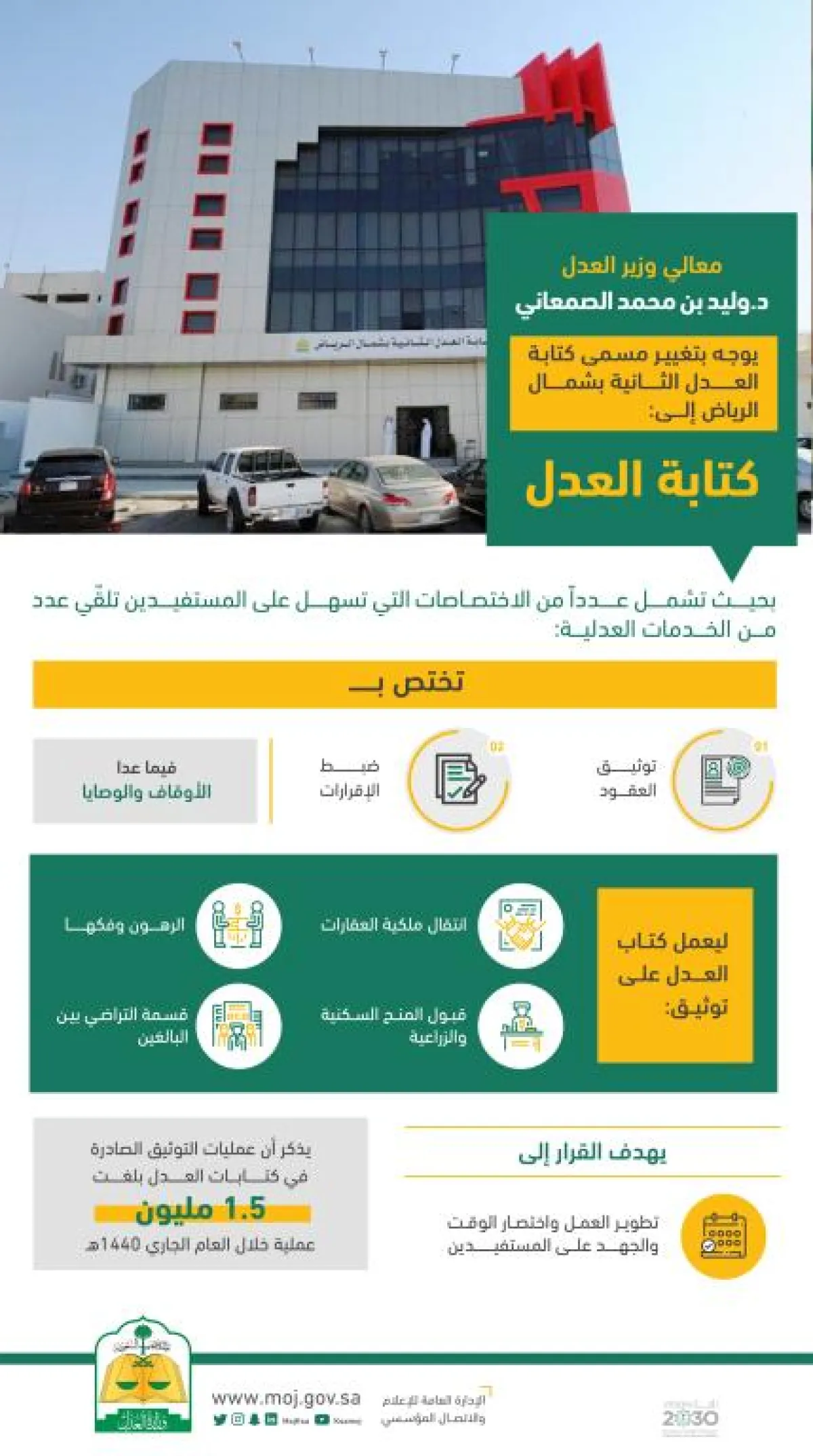 وجه وزير العدل رئيس المجلس الأعلى للقضاء الشيخ الدكتور وليد بن محمد الصمعاني بالتوسع في الخدمات التي تقدمها كتابة العدل الثانية بشمال الرياض لتصبح شاملة لأعمال كتابات العدل.