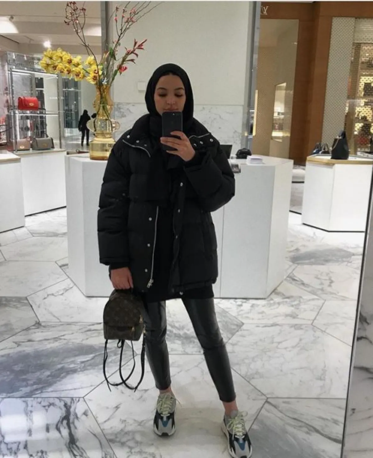 اختارت هذه الفكرة الفاشينيستا خولة مع البلوفر المنفوخ وبنطلون جلد، وطرحة باللون الأسود، لم تضع مع اللوك الكثير من الألوان لتطبيق الفكرة، فقط ارتدت حذاءً رياضيًّا رماديًّا، وشنطة لويس فيتتون البنيّة، وتُعتبر هذه الاطلالة سهلة وسريعة لمشاويركِ اليومية.