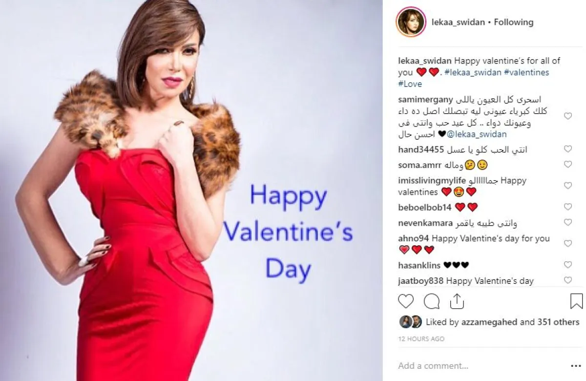 الفنانة لقاء سويدان خضعت لجلسة تصوير خصيصًا للاحتفال بيوم الحب، وشاركت جمهورها على موقع انستقرام صورها الجديدة المطبوع عليها التهنئة بيوم الحب.