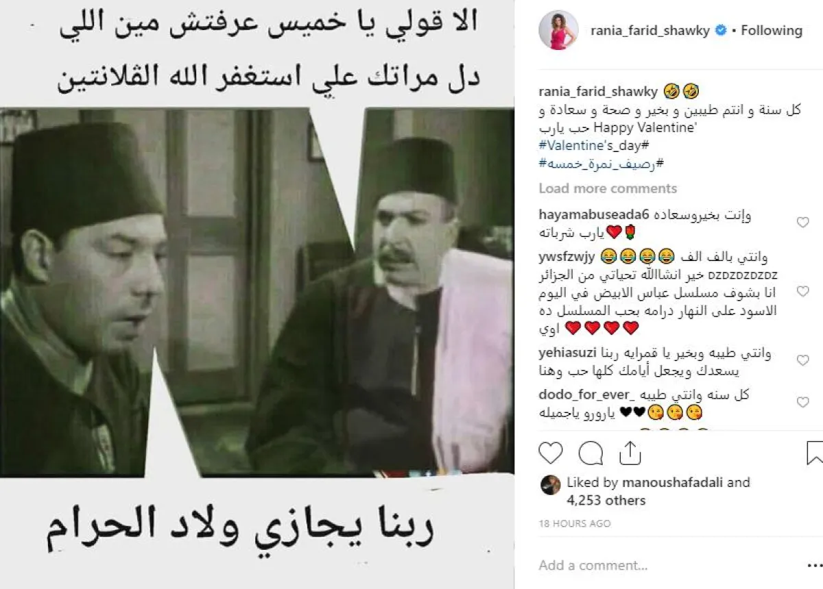 الفنانة رانيا فريد شوقي، استعانت بوالدها الفنان الراحل فريد شوقي لتهنئة متابعيها عبر انستقرام، لمناسبة عيد الحب، بطريقة ساخرة حيث نشرت صورة من أحد أعمال والدها الفنان فريد شوقي مع الفنان زكي رستم، وهو يتحدث مع فريد شوقي قائلًا: "إلّا قولّي يا خميس عرفتش مين اللي دل مراتك على، أستغفر الله الفلانتين"، ورد " شوقي "قائلًا: "ربنا يجازي ولاد الحرام".