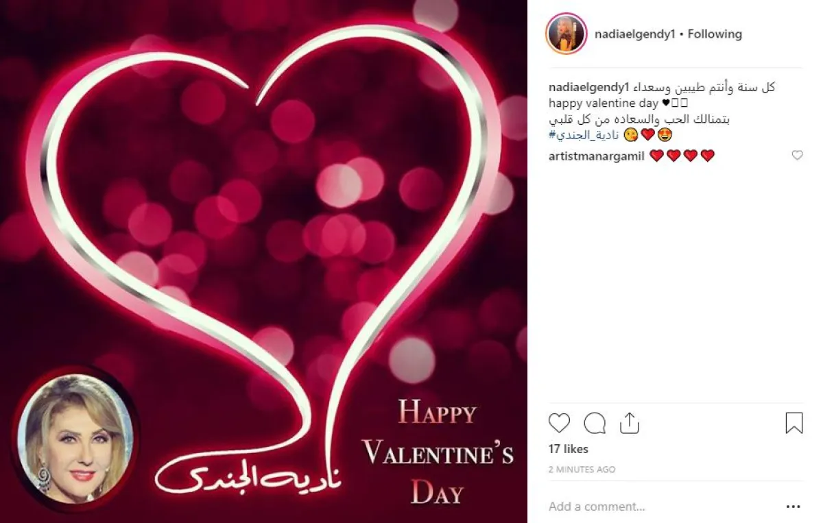 نادية الجندي اختارت وضع صورة أرشيفية لها مع قلب بدرجات اللون الأحمر، وعلقت مهنئة كل متابعيها بقولها: كل سنة وأنتم طيبين وسعداءhappy valentine day ، بتمنالكم الحب والسعاده من كل قلبي.