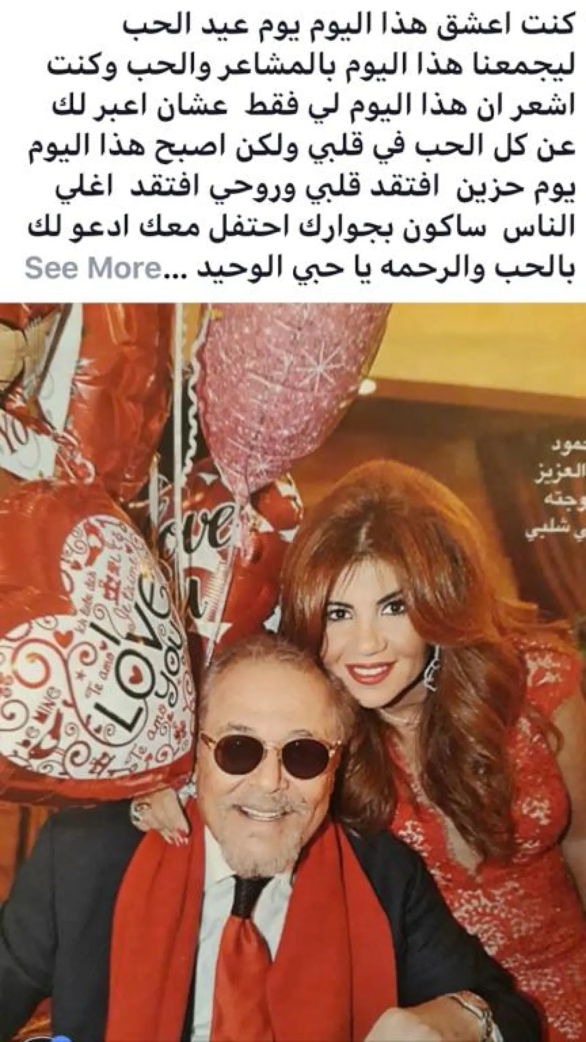 الإعلامية بوسي شلبي احتفلت بعيد الحب بطريقتها الخاصة، فقد أعادت نشر صورة لها مع زوجها الراحل الفنان محمود عبد العزيز، وشاركته كالعادة الرسائل الحزينة، وقالت: كنت أعشق يوم عيد الحب ليجمعنا هذا اليوم بالمشاعر والحب، وكنت أشعر أنّ هذا اليوم لي فقط، وعشان أعبّر لك عن كل الحب في قلبي، لكن أصبح هذا اليوم يومًا حزينًا، أفتقد قلبي وروحي، وأفتقد أغلى الناس سأكون بجوارك أحتفل معك أدعو لك بالحب والرحمة يا حبي الوحيد".