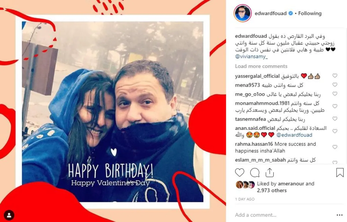 الفنان إدوارد قام بتهنئة زوجته فيفيان بعيد ميلادها وعيد الحب عبر حسابه بالوقت نفسه عبر رسالة كوميدية قال فيها: وفي البرد القارص ده بقول زوجتي حبيبتي عقبال مليون سنة كل سنة وانتِ طيبة، وهابي فلانتين في الوقت ذاته".