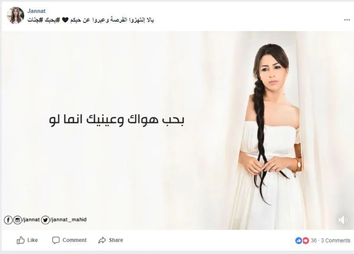 الفنانة جنات، استغلت الاحتفال لمناسبة عيد الحب لإعادة الترويج لأغنيتها "بحبك"، وهي إحدى أغاني ألبوم "اللي بيني وبينك"، والتي طُرحت عام 2007، وعلقت عليها قائلة: يالا انتهزوا الفرصة وعبّروا عن حبكم.. "بحبك" جنات".