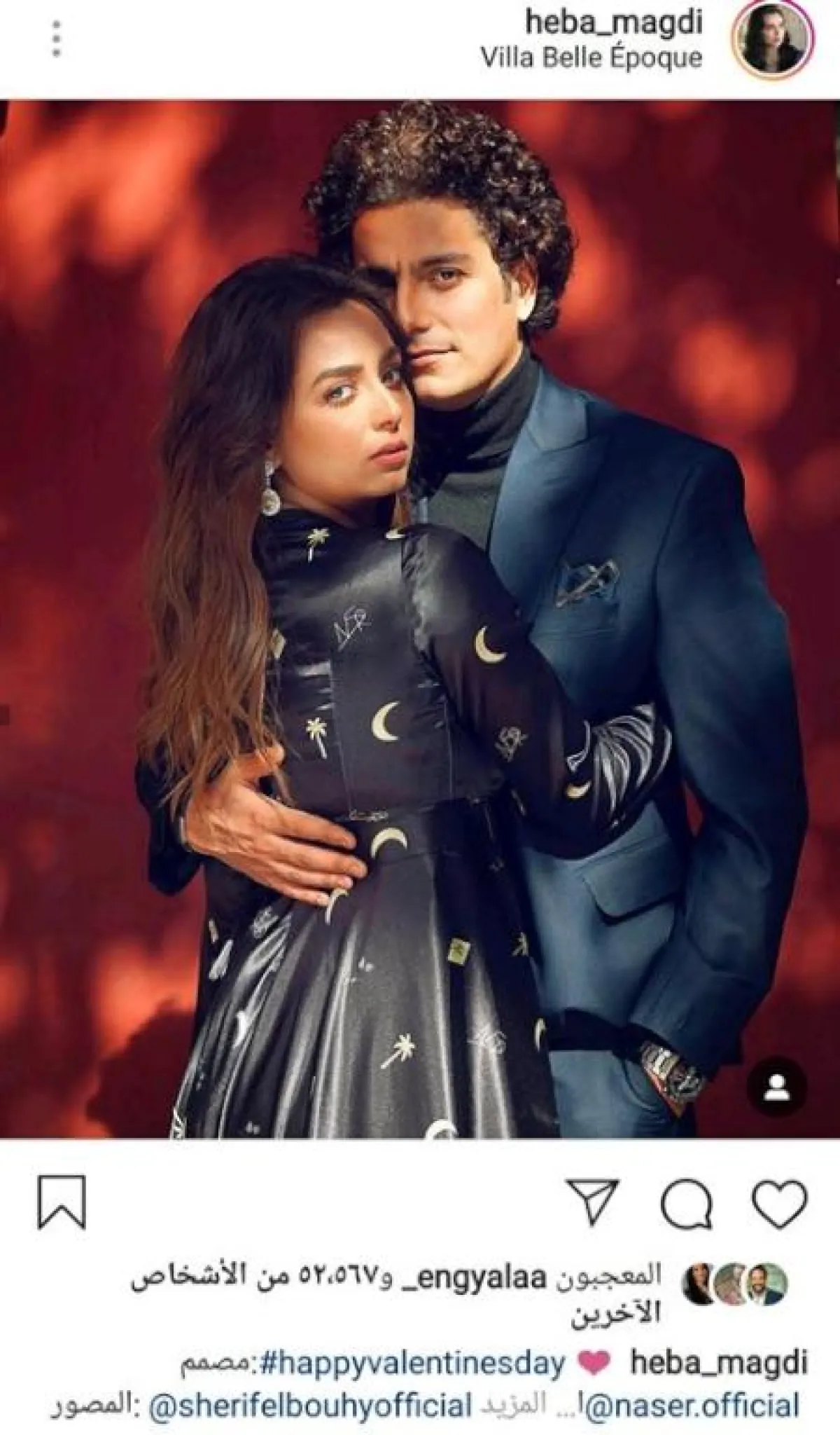 الفنانة هبة مجدي نشرت صورة جديدة بوضع رومانسي محتضنة زوجها المطرب محمد محسن، عبر حسابها الشخصي على موقع انستقرام، وعلقت قائلة: " "happyvalentinesday".