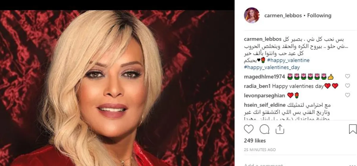 كارمن لبّس شاركت متابعيها حكمة تقول: بس نحب كل شي، بصير كل شي حلو .. بيروح الكره والحقد وبتخلص الحروب...كل عيد حب وإنتو بألف خير.