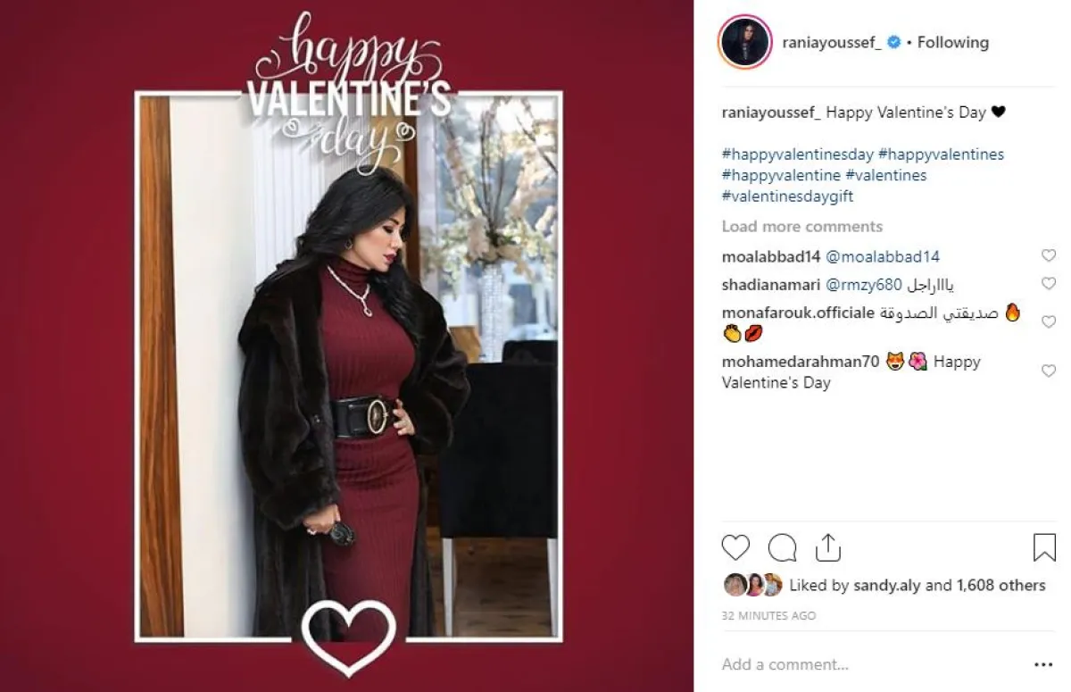 رانيا يوسف اختارت اطلالة غريبة بفستان كلاسيكي محتشم باللون الأحمر القرمزي، وعلقت بالتهنئة المعتادة happy valentine day.