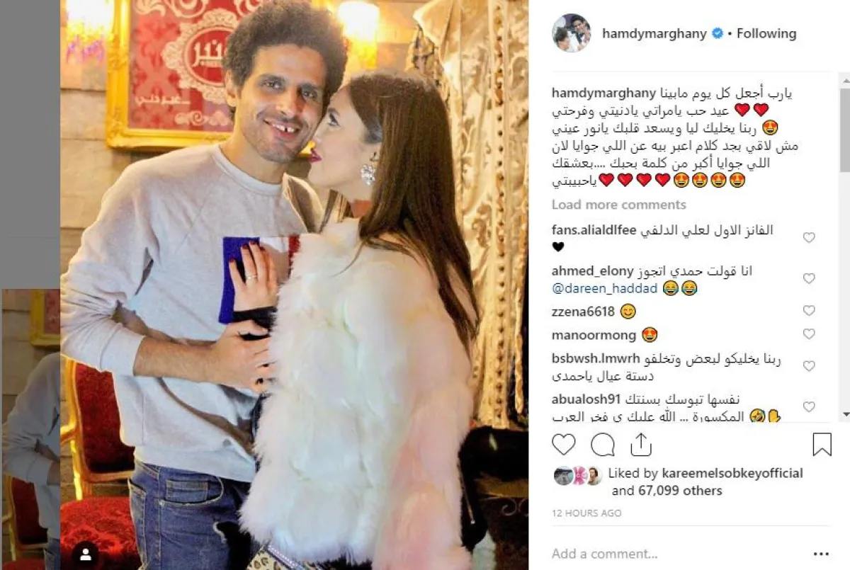 نجم مسرح مصر الفنان الشاب حمدي الميرغني، احتفل بعيد الحب مع زوجته الفنانة إسراء عبد الفتاح، وعبّر لها عن مدى حبه في رسالة عبر صفحته الشخصية على موقع الصور انستقرام، بنشر صورة تجمعه بزوجته، وكتب عليها رسالة حب قائلًا:"يارب اجعل كل يوم مابينا عيد حب يامراتي يادنيتي وفرحتي، ربنا يخليكي ليا ويسعدك يانور عيني.