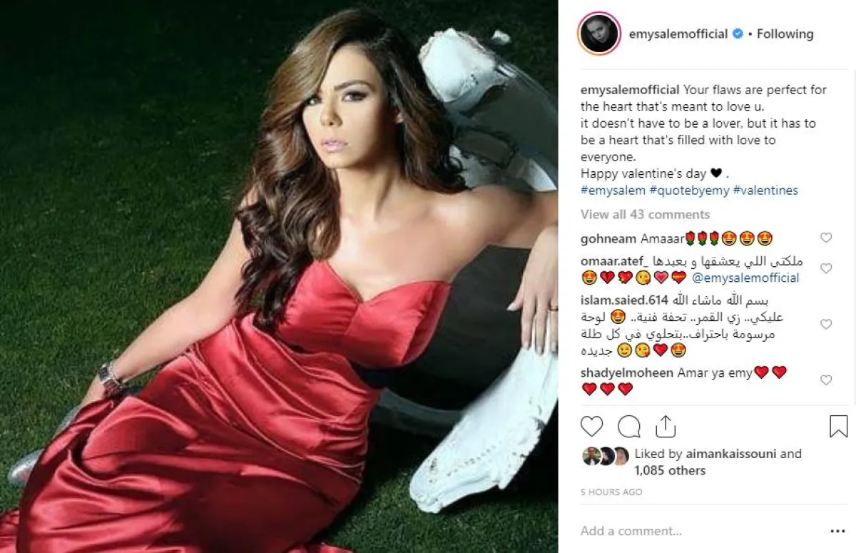 إيمي سالم خضعت لجلسة تصوير جريئة جدًّا باللون الأحمر أيضًا، وعلقت عليها بمقولة أكثر جرأة وهي: عيوبكِ ستبقى مثالية للقلب الذي يهدف إلى حبِّك، ليس من الضروري أن يكون عشيقًا، ولكن يجب أن يكون قلبًا ممتلئًا بالحب.