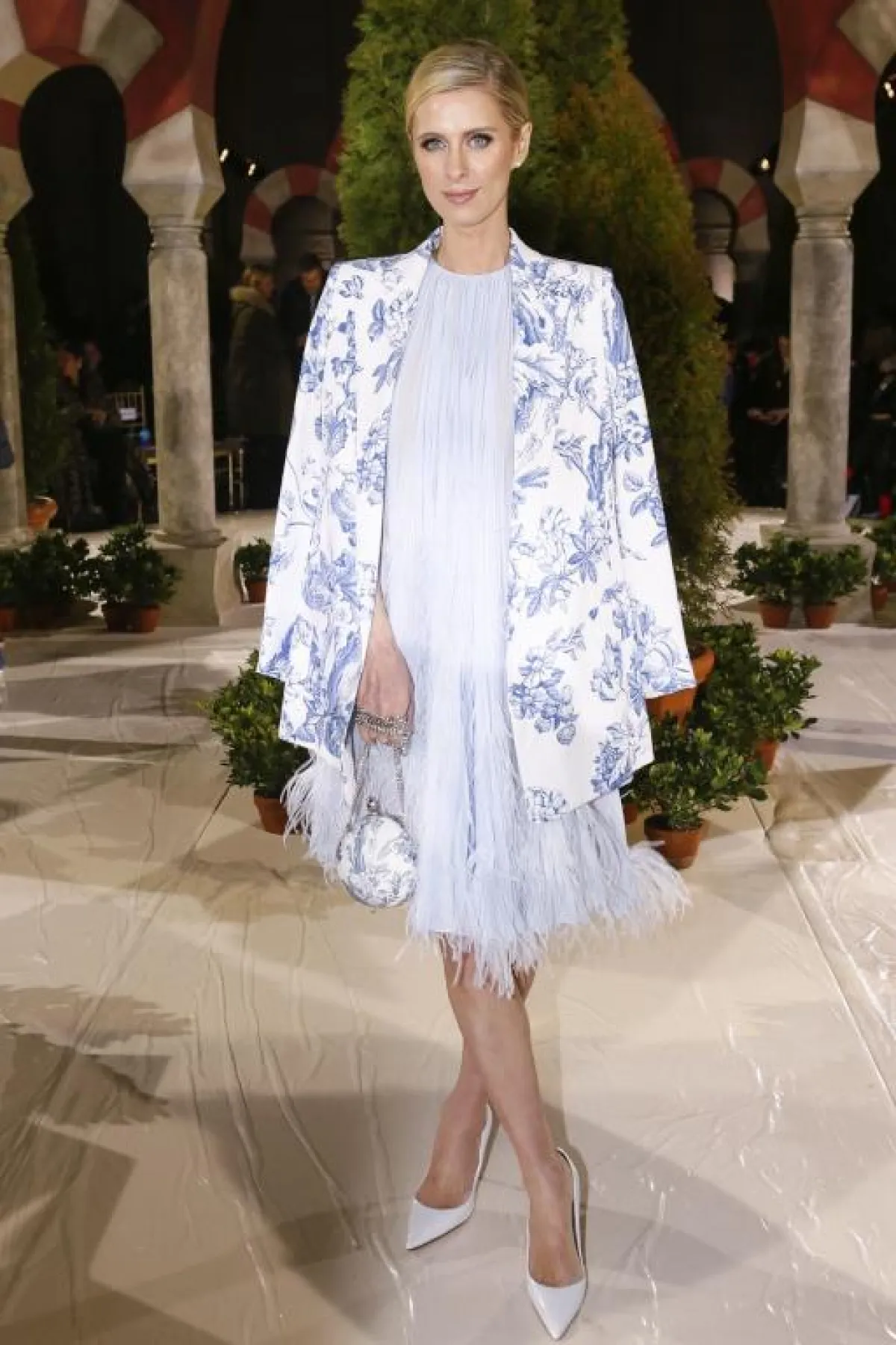 اطلالة ناعمة اعتمدتها “نيكي هيلتون” Nicky Hilton في عرض أزياء دار “أوسكار دي لا رينا” Oscar de la Renta، حيث نسقت فستان ميدي باللون الأزرق الفاتح، مزينًا بالريش، ونسقت معه جاكيت بليزر معرقًا، وشنطة يد أنيقة مماثلة لنقشة البليزر، وحذاءً بكعب عالٍ باللون الأبيض.