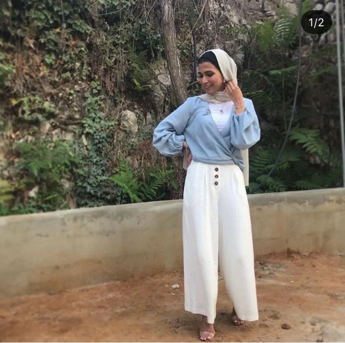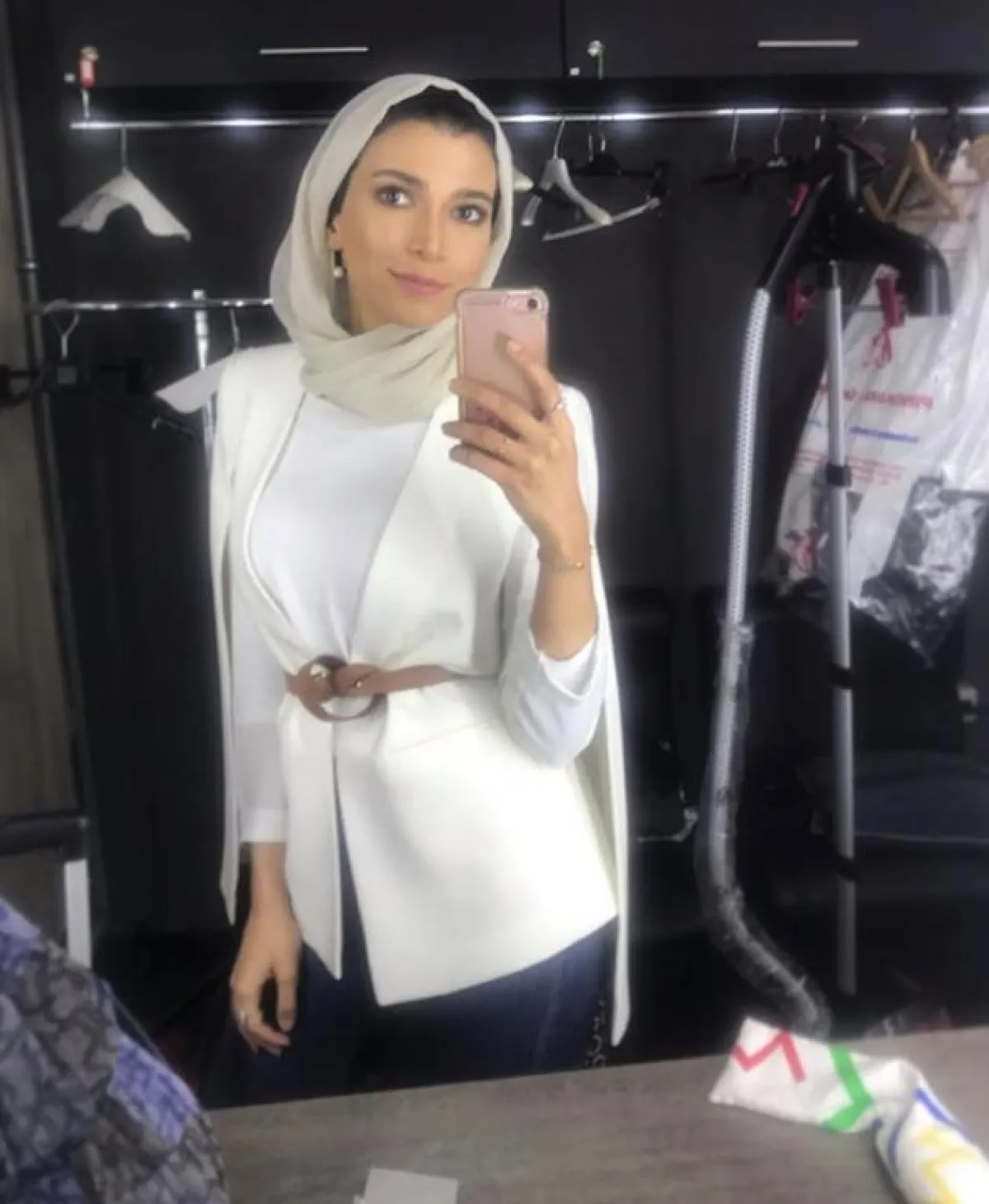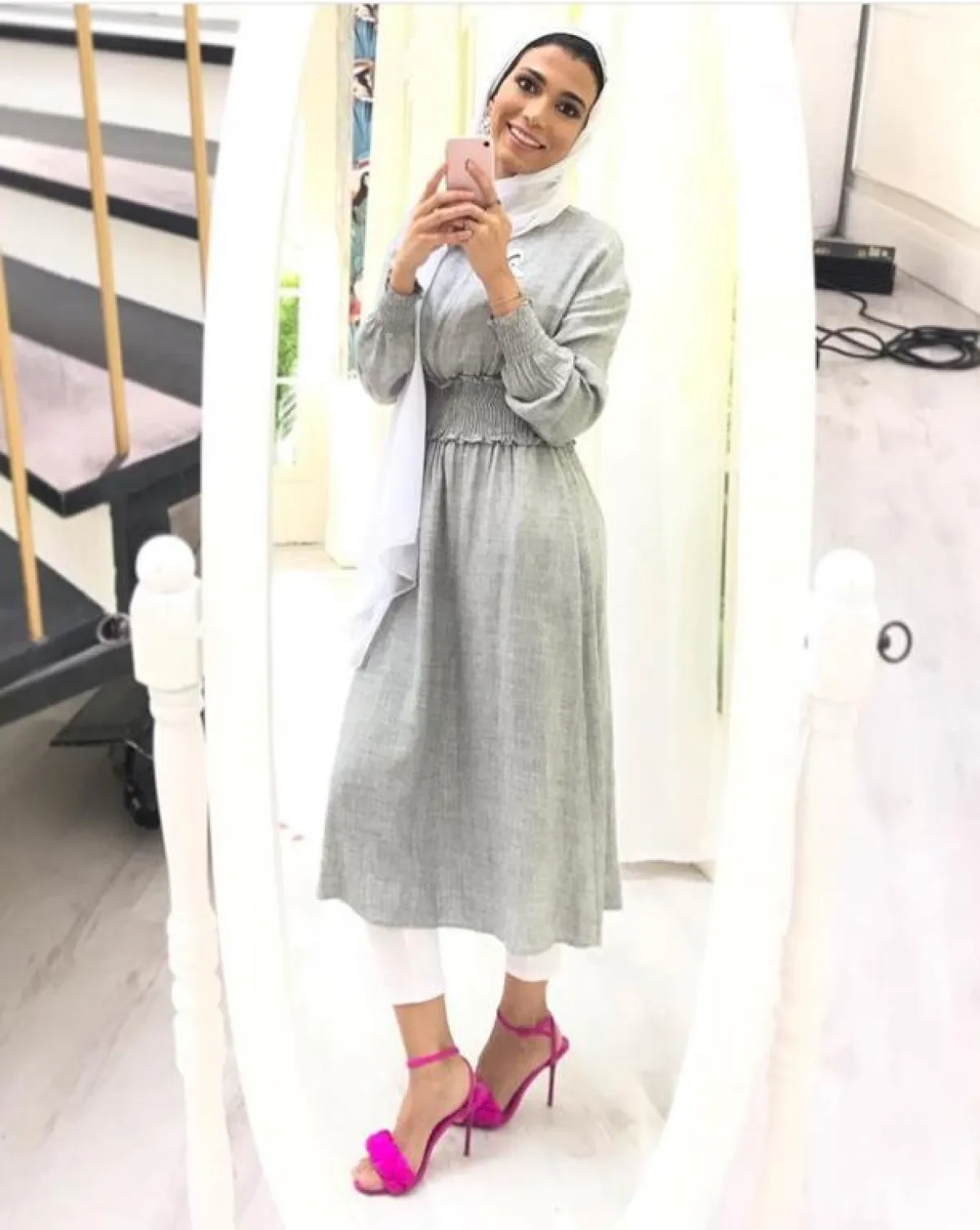 لفة الحجاب التقليدية لا تستغني عنها أيضًا أيّ صبيّة محجبة، وكذلك اعتمدتها هبة مجددي بتنسيقات مختلفة، كاطلالتها مع الفستان الكاجوال الرمادي، اختارت الطرحة البيضاء، بلفة بسيطة وعشوائية، ولم تعتمد اللفة المُحكمة الخليجية المعروفة.