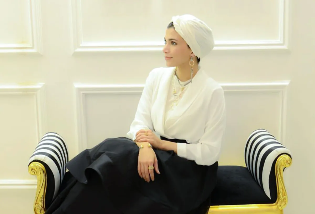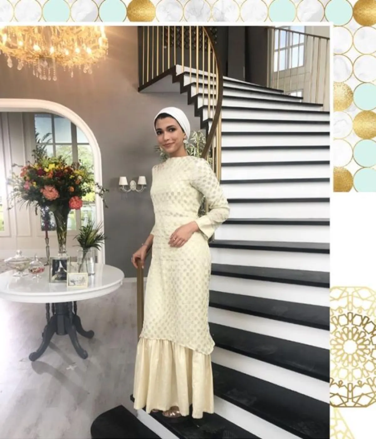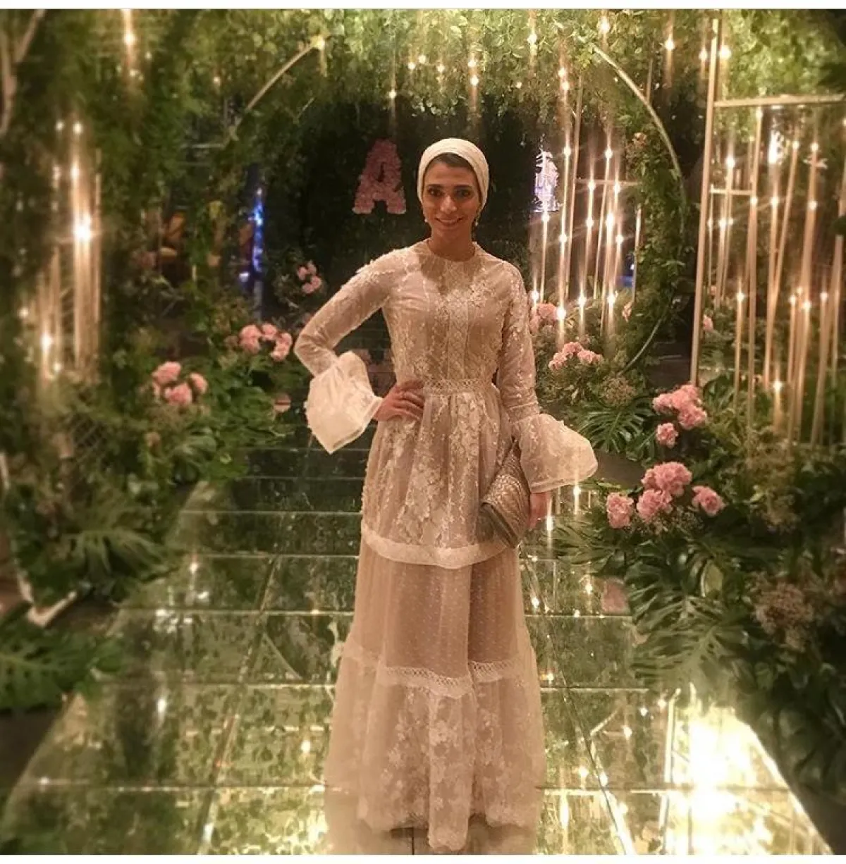 الفساتين كذلك عادة ما تفضلها هبة مع التوربان، كالفستان الأبيض الطويل المطرز بالدانتيل الناعم، نسقت معه توربان من الدانتيل، لاطلالة هادئة وحيادية، ناسبت وجهها الناعم، وذوقها البسيط.