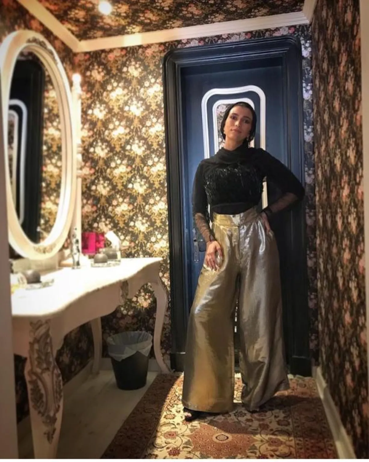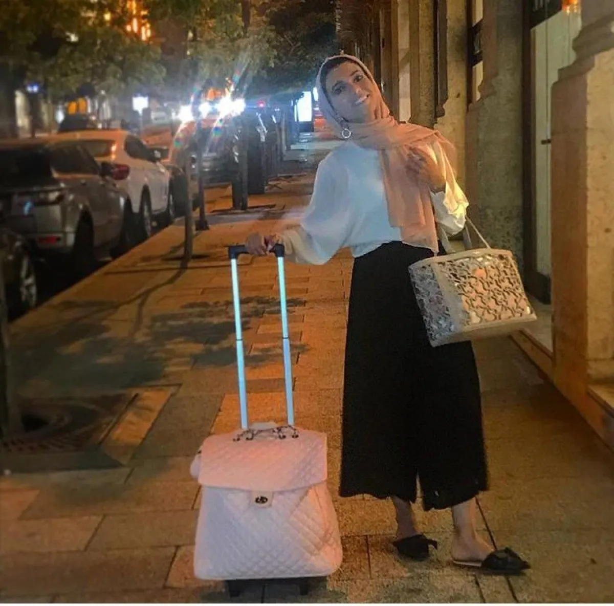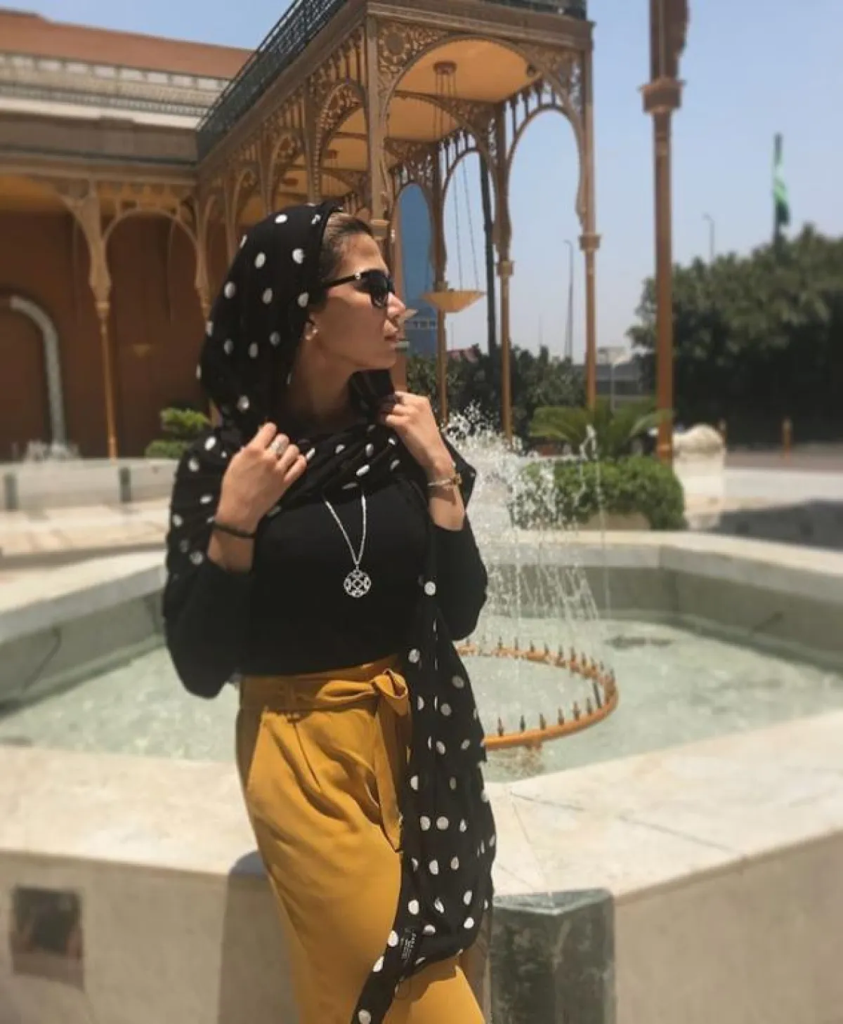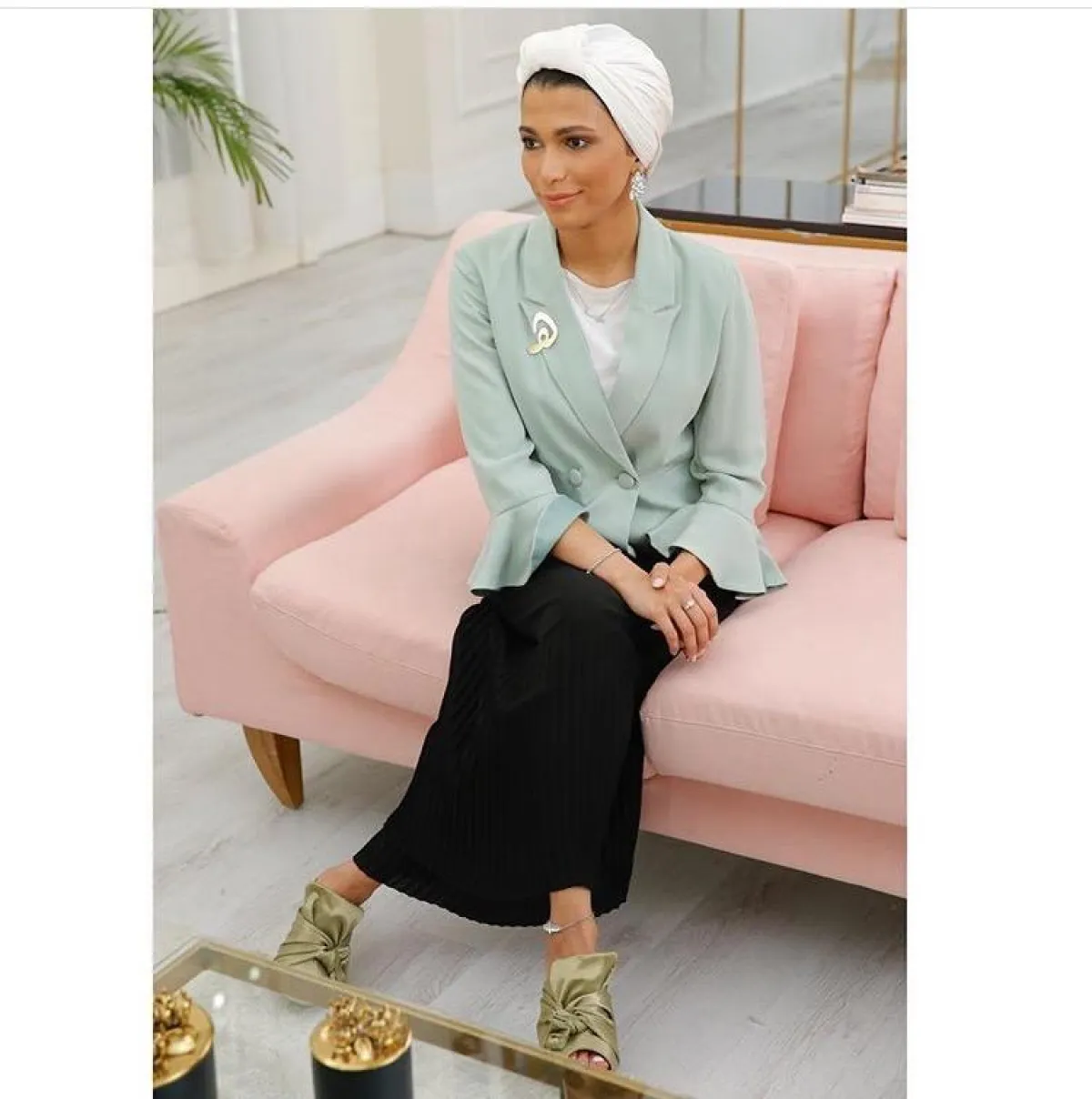 وبأوقات السفر اختارتها هبة، ولو أنّ التوربان قد تكون عملية أكثر، إلا أنها بدت عصرية ومريحة مع خامة الشيفون الخفيفة، والتنورة عالية الخصر.