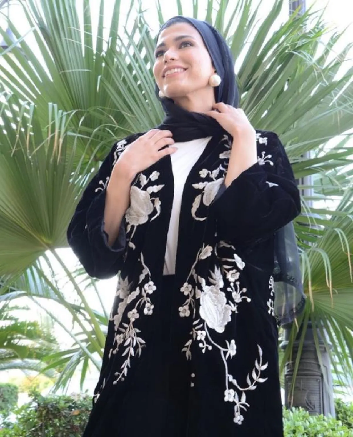 أعجبنا كذلك اختيارها للحجاب الطويل مع العباية، وارتدت الباندا أو البطانة لتترك الطرحة الخارجة من دون دبابيس، لتُبرز أقراط الأذن بأحجار اللؤلؤ تضيف إضاءة لوجهها.