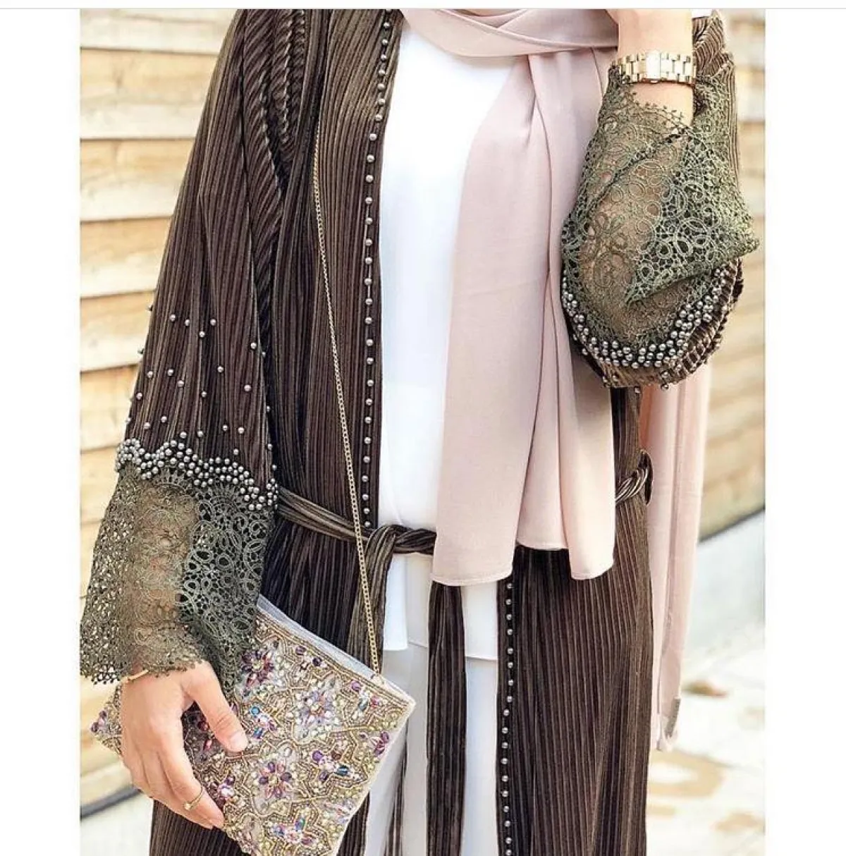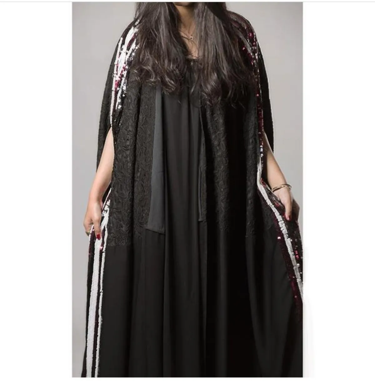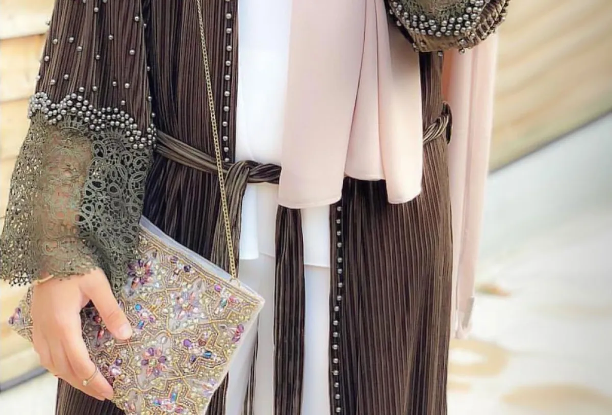 كذلك هذا الموديل باللون الرمادي مع الأكمام المطرزة بخامة الدانتيل الأنثوية من عباية بوث Abaya Buth، سيكون خياركِ الأنيق لمناسبات ما بعد الظهر، بخاصة مع خامة البليسيه وتطريزات اللؤلؤ الجذابة، ارتديها بشكل مفتوح مع الفساتين الميدي الطويلة، وطرح الستان الناعمة، أما الكلتش فاختاريه مطرزًا كذلك بالدانتيل واللؤلؤ.