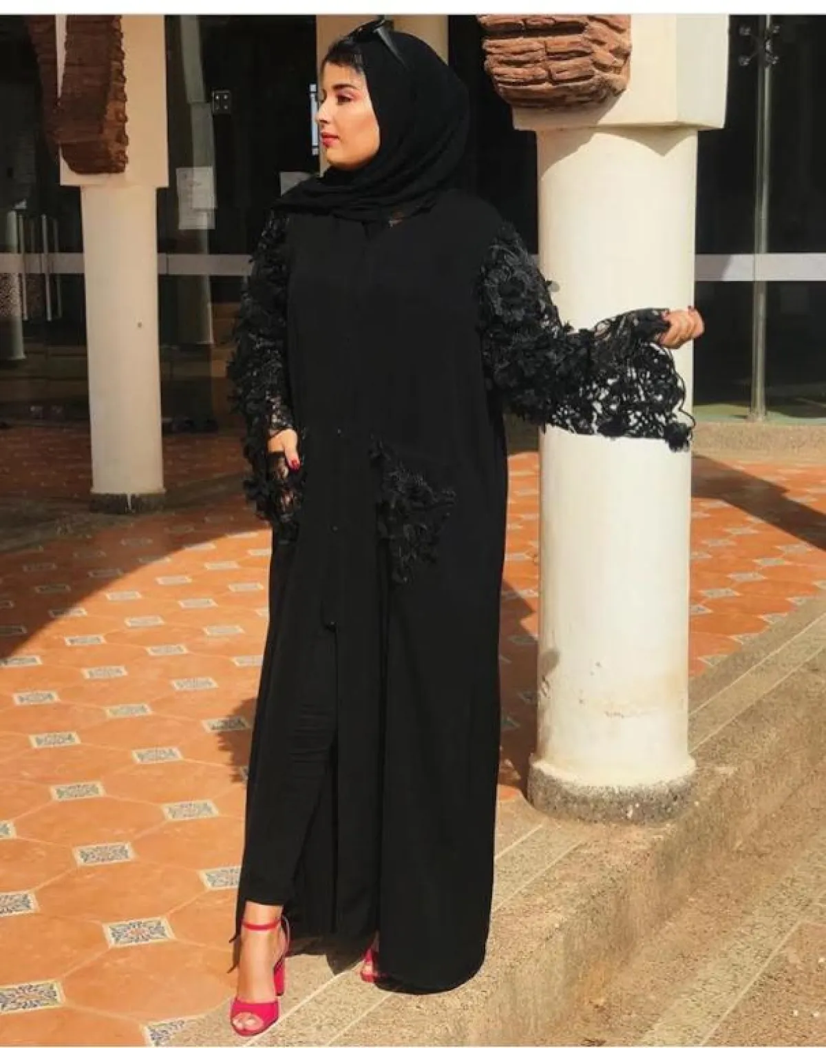 يمكنكِ اعتماد هذا الموديل المطرز بالدانتيل على إطار العباية من Abaya Gamra عبايات جمرة، وارتداؤها بشكل مفتوح، نسقيها مع الجينز الأزرق الفاح، أو التنانير العالية الخصر، ولاطلالة كلاسيكية، اعتمدي على الألوان الداكنة، والكعب المدبب الميتالك.