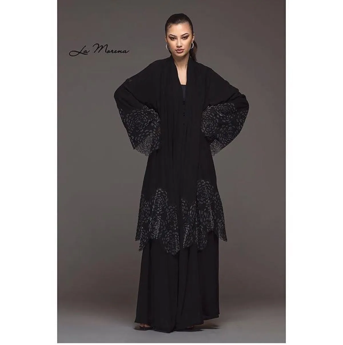 الأسود مع خامة الدانتيل يُعتبر أحد الخيارات الجذابة التي عادة ما تعتمد عليها بيوت الأزياء للعبايات، كهذا الموديل من لامورينا عباية La Morena وهي من القطع التي تناسب كل الصبايا وكل أوقاتِك، لا تتخلّي عنها بدولاب ملابسِك.