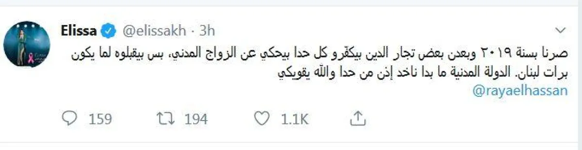رفعت الفنانة إليسا الصوت عالياً، في وجه الأصوات المعارضة للزواج المدني في لبنان، وكتبت في تغريدة وجّهتها لوزيرة الداخلية اللبنانية ريا الحسن جاء فيها " صرنا بسنة ٢٠١٩ وبعدن بعض تجار الدين بيكفّرو كل حدا بيحكي عن الزواج المدني، بس بيقبلوه لما يكون برات لبنان. الدولة المدنية ما بدا ناخد إذن من حدا والله يقويكي".