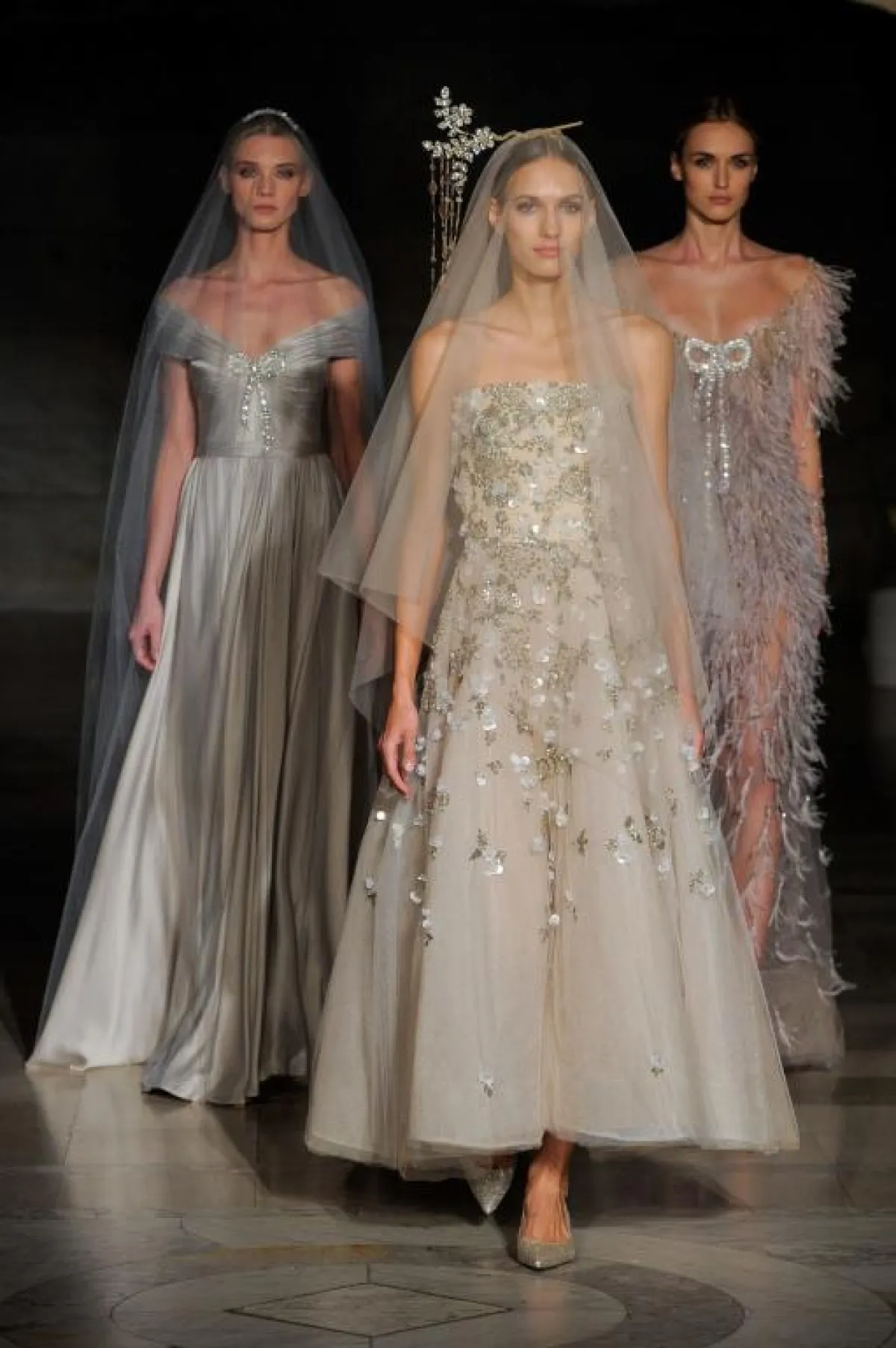 الفساتين المطرزة عادة من ناحية الصدر بشكل كبير، يناسبها الطرحة القصيرة، لكي تسلّطي الضوء أكثر على التطريزات كالفستان بخامة الستان الناعمة، مع التطريزات الكريمية بالخيوط اللامعة.